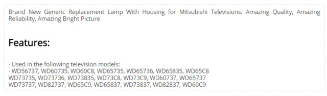 Mitsubishi 915B403001 Replacement Bulb Lamp TV DLP Television Projector WD65735 Fast & Free Shipping Great Customer Support Guaranteed Quality DESCRIPTION Brand New Generic Replacement Lamp With Housing for Mitsubishi Televisions. Amazing Quality, Amazing Reliability, Amazing Bright Picture Features: Domestic Shipping: All Domestic packages are shipped Ground Shipping For Free (Unless other shipping method was selected on the order) - We offer 30 days moneyback guarantee PayPal is our preferred method of payments it's the quickest, easiest and most secure way to pay for your goods or services online. PayPal offers buyer and seller protection should there be a problem. If you do not have a PayPal account, to get started and buy your first item with us is very easy. Simply click on the 'Buy It Now' button and follow the eBay checkout steps. Select PayPal as the payment method you then will be given the chance to enter your card details in to PayPal's secure checkout in order to pay for your order. Once the payment has been made, you will then be given the opportunity to make your own PayPal account to make paying for your items in the future very easy. Should there be a problem with payment please do let us know. We take our reputation seriously, we buy and sell online, so we understand the value of trust. If you are unsatisfied with your order, please contact us and we will work with you to resolve it to your satisfaction. If you have any queries, please contact us via ebay. We usually respond within 24 hours on weekdays. Thank you for visiting our ebay store!