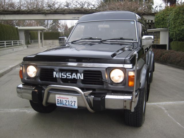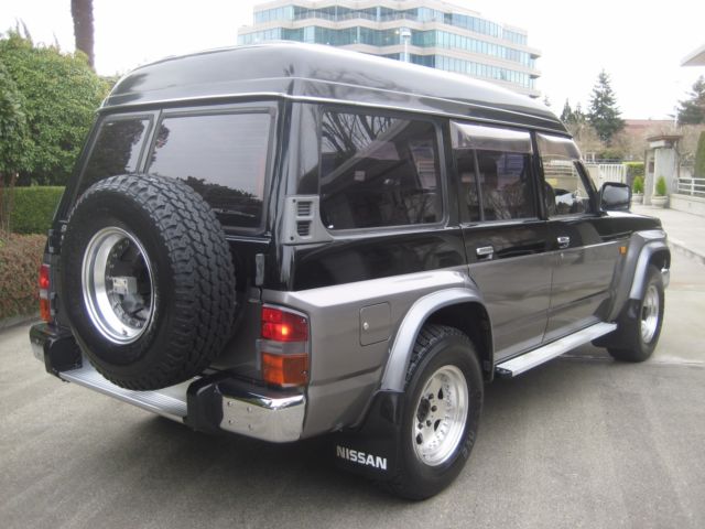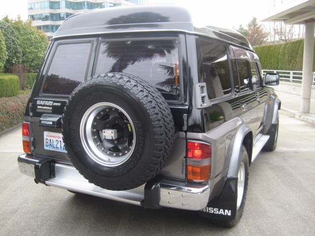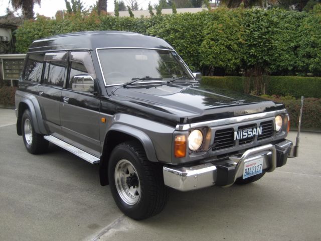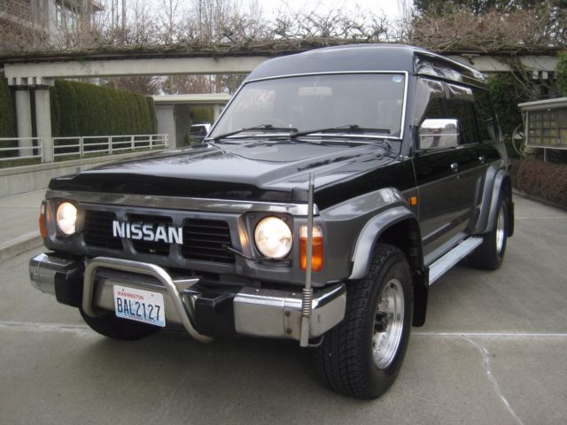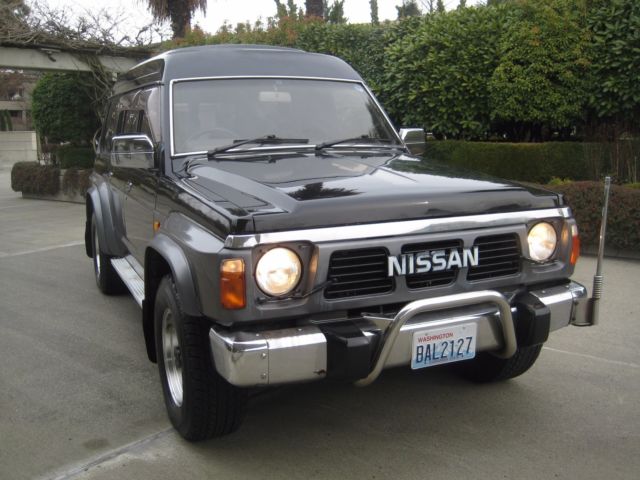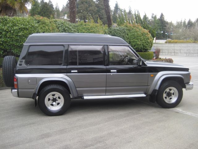 Offered For Sale -This is a Rare Opportunity to own a 1991 Nissan Safari GranRoad 4x4 (4wd) Diesel with the Rare Factory High Top. Japanese VIN - VRGY60617088. 113,000 kilometers / 70,000 Original Miles. Finished in Black Gloss and Silver Metallic Paint, the Exterior of this Rust Free Nissan Diesel is Very Eye Catching. The Interior is Gray Cloth featuring a Rear Bed Conversion for Sleeping. There is a lot of Interior Room for spending the weekends at the Lake, Mountains, Trails, or wherever you will wander. This is a Tough Trail Rig; Designed for the most difficult of all terrain. This is a True 4 wheel drive. There is Automatic mode for Shift on the Fly for 4 High. There are also Locking Hubs to take it from automatic mode, to a true 4x4. Lock the Hubs, shift into 4 High or 4 Low and away you go. There is literally not much that can stop or get in the path of where you would like to travel. A very highly optioned vehicle with Power Options, such as Windows, Locks, Mirrors & Air Conditioning. Full Gauge Package so you can understand the Pitch, Yaw and Roll of the vehicle. Front and Rear Heaters. Mechanically in excellent shape. The 4.2 liter I-6 Naturally Aspirated Diesel starts immediately and runs smoothly and tight. The engine is so tight - it starts on 1st click of the key and crank of the starter. The Transmission shifts perfectly, featuring a 4 speed automatic with differential lock out. There is also a Power Mode - which has it shift quicker and only in 1st three gears. Great for Running around town or off-road. Brakes and tires are in good shape and all Fluids are Fresh. Body is in great and straight condition. There are really no dents or dings that I can see. But if there are, they must be very minute. Minor scratches. Paint is in great shape for a vehicle of its age. Minor fading on the black paint on the roof and a little on the hood. But not much. I would call it pretty much rust free, as it is clean on the body and undercarriage. But on something of this age, I would say there is nothing true as 100% rust free. The power antenna and clock are not operational. One power door lock on the passenger side does not always unlock, but always locks. However, after checking it out and driving it for quite some time, everything else is in great working order. I have all the importation documents, and a Free, Clean and Clear Washington Title with Current Registration. I imported this Nissan Spring of 2016 from Japan. Cars are a Total Hobby of mine and I like having and offering Rare Vehicles for Sale. One of the most sought after places in the world for these Nissan's to be imported too is Iceland. As Iceland is a place for Rugged, Tough, True 4x4's.You will be Very Pleased with this Nissan. Bid with Confidence that you are getting Truly a Rare Vehicle. |