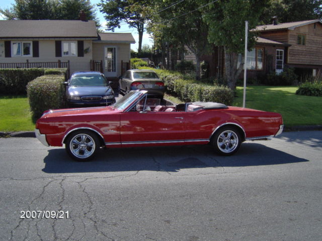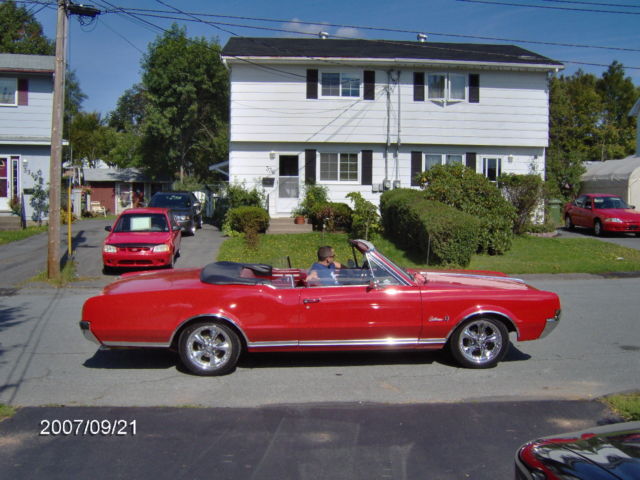 | SELLING MY 1967 CUTLASSCONVERTIBLE-REDRED/BLK TOP-330CI ENGINE RUNS GREAT NO ISSUES-FULL BODY OFF FRAME RESTO DONE IN 2006-UPGRADED EXHAUST/MDS INGNITION LAST SUMMER-SITS ON CHIP FOOSE RIMS LOTS OF RUBBER ON TIRES- CAR IS VERY CLEAN AND RUNS GREAT MOTOR IS VERY STRONG!!! |