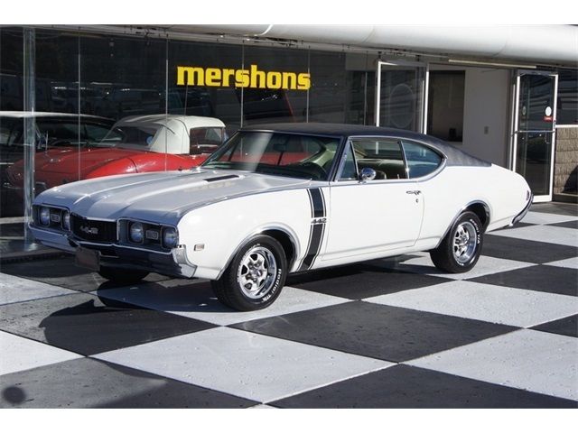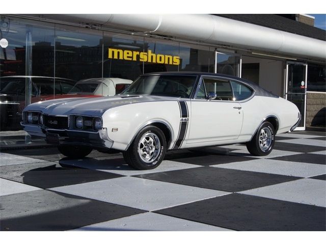 1968 Oldsmobile 442 equipped with the 400ci 'Rocket' V8, utomatic Transmission and 12-Bolt Rear. Original "T" Code Ivory Exterior with a Black Vinyl Hardtop and Code 944 Gold Interior. Options include Factory Air Conditioning, ower Steering, ower Disc Brakes, ucket Seats, onsole, M/FM Radio and Proper Olds Rally Wheels with White Letter Radials. Very nice left alone Original 442 with nice body fit and lots of integrity inside and out. Clean unmodified original engine compartment, ust free trunk with original spare and jack, nd nice chrome, tainless and trim.