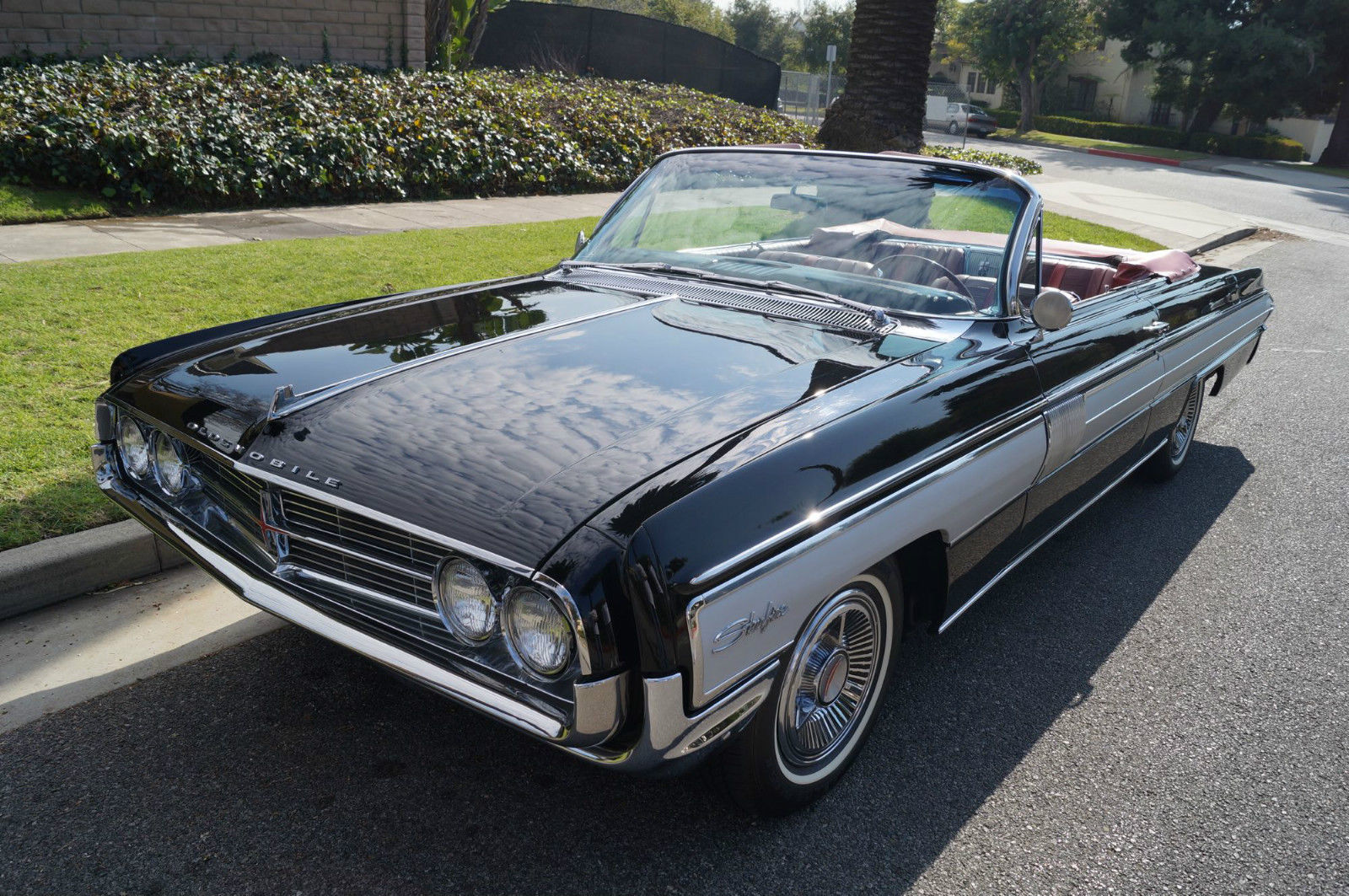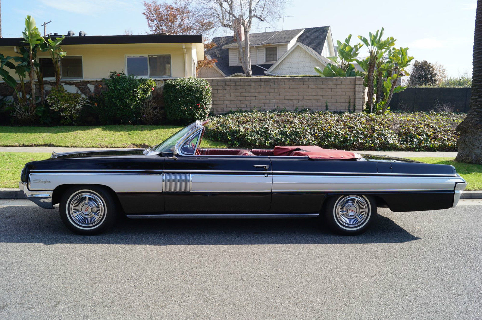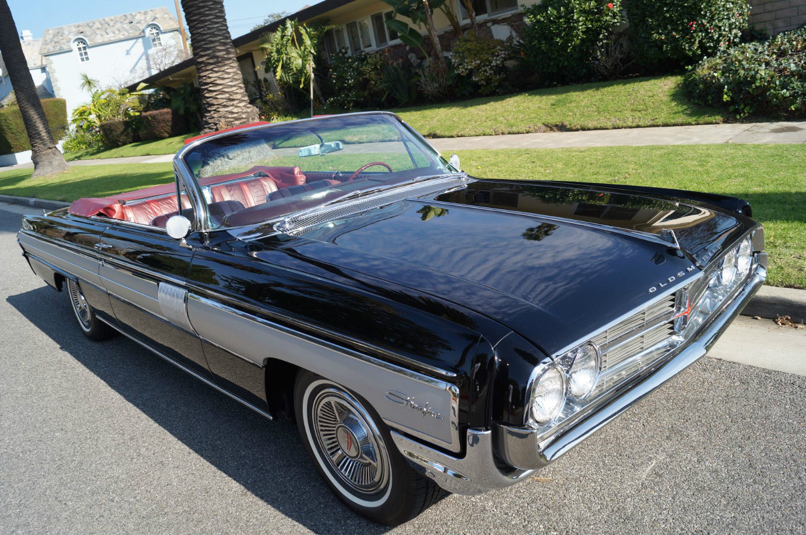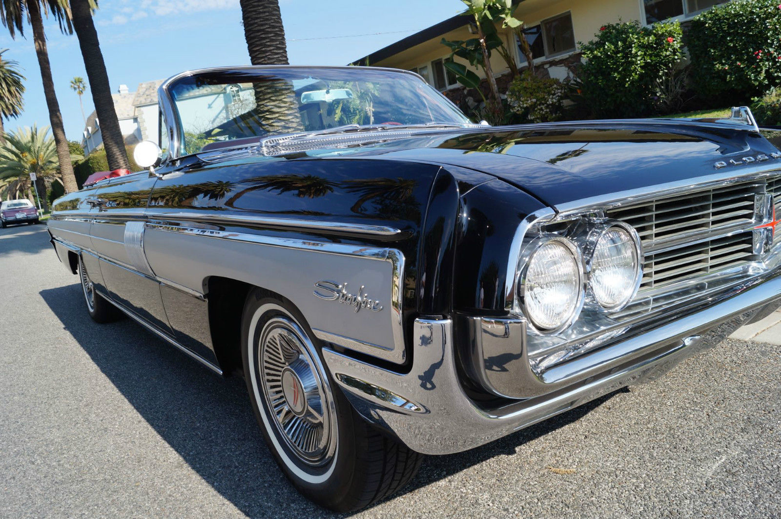 | Please note that experience shows us that the photobucket of over 100 large pixel pictures posted here are in most cases best viewed and downloaded using the very latest and most updated version of the 'Firefox' browser as some other browsers and especially older browser versions are not capable of accommodating the size of the download. Over the years our clients have overwhelmingly been appreciative of our many unaltered large pixel photos posted in our ads and our feedback has been that it is very rare that a dealer will post all but the most flattering of professionally finished photographs. We prefer to post the many photos taken of the car. in sometimes unflattering but natural sunlight. in order for our prospective buyers to be able to see true and reliable images of the car advertised and that is the reason for some seemingly duplicated shots. We trust you will agree. West Coast Classics are proud to present an absolutely stunning and virtually flawless and only a few years old frame off restored example of this very desirable 1962 Oldsmobile Starfire 394/345HP V8 Convertible with factory options including: Starfire V8 Engine with 10. 50-1 Compression. igh Speed Cam Shaft. ltra High Compression Cylinder Heads. ual Exhaust System. pecial Fiberglass Packed Muffler. Foam cushioned Leather Bucket Seats. achometer. -S Hydra-Matic automatic transmission. Power Top. ower Steering. Power Brakes. Power drivers seat. Power Trunk Release. ower Antennae. lectric clock. Courtesy lamps. Soft ray tinted glass. Original Wonderbar AM radio. Console with shifter. Windshield Washers. utside rear mirrors. Original Owners Manual. The Starfire was Oldsmobile's entry into the personal luxury market built on the Super Eighty-Eight's 123-inch wheelbase frame. The list of standard equipment included a more powerful V8. Hydra-matic drive. sports console with shifter. tachometer. courtesy lamp package. two-speed wipers. power brakes. power steering. brushed aluminum trim. dual exhausts and leather trim. Oldsmobile introduced the new Starfire in mid-1961. It was a high performance. high style. luxury automobile that was true to the company's rich performance history and offered a host of distinctive features. The Starfire returned for 1962 to include a hardtop variant. Priced around $4. 00 for the Starfire Hardtop Coupe and $4. 44 for the Starfire Convertible; the cars were equipped with all the features found in the Super Eight-Eight plus brushed aluminum side panels. a sporty cockpit featuring bucket seats. leather upholstery. floor console and power-operated front seats. Power was from a 394 cubic-inch V-8 engine that offered 345 horsepower and 440 pound-feet of torque. courtesy of a Rochester four-barrel carburetor. 10. 5:1 compression. a revised camshaft profile. an efficient combustion chamber design and a free-flowing dual exhaust system. The Oldsmobile Starfire was easily distinguishable from its Super 88 counterparts by the addition of brushed aluminum side panels. Arguably this was the first muscle-car from Oldsmobile since it combined a very powerful engine in a small. compact body. The Starfire's sporty and luxurious hardtop coupe and convertible embodied the personal luxury cars for Oldsmobile with leather bucket seats. sport and special luxury trim. "Distinguished . . Distinctive . . Decidedly New" was how Oldsmobile advertised their all new 1961 first full-fledged Starfire series. Oldsmobile chose the General Motors 1961 Motorama which opened on November 3. 1960 at the Waldorf-Astoria in NYC to debut the new one-model series. This series remained until the revolutionary Toronado picked up the Oldsmobile personal-luxury banner. At select Oldsmobile dealerships in January 1961 the first Starfires began arriving. On the outside the Starfire included two slim parallel hood moldings and a 4-inch wide band of brushed aluminum on the sides. touches which were exclusive to the Starfire. The 1961 Starfire also sported a chrome-plated air cleaner perched on top of the four-barrel carburetor and shiny valve covers and oil filler cap. Burning only premium fuel. the Starfire had a 10. 25:1 compression ratio. Another unique advertising campaign was a direct-to-dealer piece that urged dealerships to stage special open houses to showcase the new model and gave interested dealerships with up to 500 invitations and envelopes. This particular example is an older frame off restored example and beautifully finished in its original factory (Color Code A) 'Ebony Black' color paint over its original brushed aluminum side panels with a very striking original (Trim Code 935) 'Red over Garnet Mist' two-tone interior with a matching color soft top. the car looks extremely impressive and is still in virtually flawless condition throughout. All the factory options are working as they should and the car has all it's original logos and its original radio and the brightwork design on the dashboard. the dashboard itself. the convertible soft top. the carpets and all the seats are in virtually flawless condition! All the chrome work is also virtually flawless and the original spare wheel and jack is in the trunk. This particular car also obviously drives absolutely magnificently - must be driven to be fully appreciated - drives straight as an arrow with no strange road wobbles. shakes or rattles - a truly remarkable daily driver that will really give any modern day sports car a run for it's money! The transmission shifts smoothly through all the gears and the temperature always remains cool! Drives exactly as it must have when brand new! It is hard to pin down the first actual muscle car; some have asserted that it is the 1949 Oldsmobile Rocket 88. which was built with speed in mind and with an overhead valve V8 placed in a mid-size car with a relatively lightweight body. A lot of observers cite the next big step in the evolution of the early muscle car to be the introduction of the 1955 Chrysler C-300 with its 300 horsepower