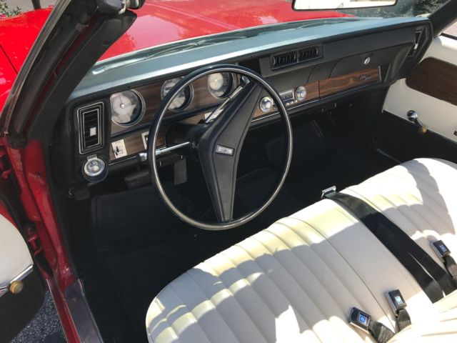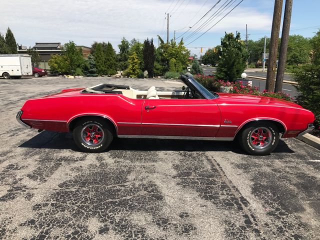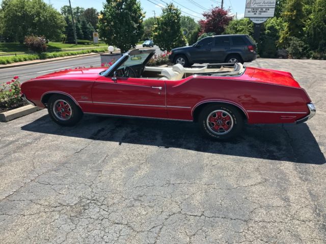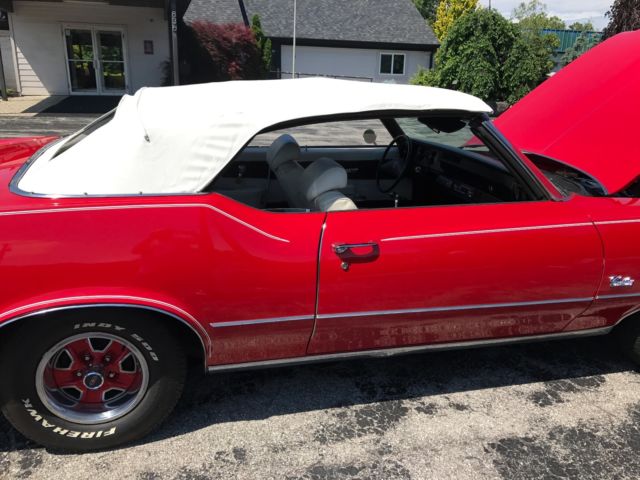 Beautiful 1972 Olds Cutlass Convertible purchased in 2008 at the Mecum Car Auction in Indianapolis. Red with white interior. The pictures will not do this car justice, it really must be seen and driven. It drives excellent and the owner has only put 243 miles on the car since purchased in 2008. It currently has 70,231 miles on the car. The mileage could go up as the car is for sale locally. The correct engine is the Olds Rocket 350 with a 4bl carburetor, and it comes with the following options. Power brakes, power steering, power convertible top, automatic transmission, air conditioning, original AM radio, matching rally wheels, full spare tire and convertible boot cover. According to the VIN and the Mecum Research team everything on this car is correct with the exception of the color. It was originally Nordic Blue. The VIN is, 3J67K2M204044. The paint is a 9.9 out of 10, and the exterior is the same. Tires are in excellent condition but are older. The car has been stored in a climate controlled garage along with the owners other vintage vehicles. The car has been routinely maintained by his mechanic. Feel free to contact me with any questions.