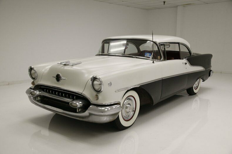 1955 Oldsmobile 88 Hardtop "Excitement rides with you, when you ride a Rocket Oldsmobile...For here is a car more active than your imagination. free and felt and vibrantly alive in every wonderful way! For taking off or taking a curve, for smooth stopping and easy steering, for easing through traffic or breezing along, you'll find that Oldsmobile is different.....dramatically different, with its flying color flair go ahead look, and brilliant beauty." All stated in the print advertising from 1955, so it HAS to be true! For consignment an interesting combination of some aged steel panels throughout the car showing rusting and pitting, nice rust free steel panels for the exterior bathed in semi gloss two tone black and white, and the original 348ci now having the advantage of tri power intake and carbs to feed it. A snappy two tone red and black interior with a few dents and dings, all this adds up to some interesting charm, that after your sit in it, and take it for a drive, you get it, and will begin saying, I love this car just as it is! Exterior Looking much like your father's Oldsmobile, 1955 differed up a large grille with the OLDSMOBILE badging letters as its teeth. Looking like an open mouth with the corresponding curves of the bumper, central big center bar with the turn signals and running lights and the upper hood curved trimming which completes the top "lips" it makes a loud statement. Single chromed bezeled headlights rest atop either front fender and in the center is the ringed globe badge emphasizing the power of the Rocket 88 under the hood. Just above on top front can center of the hood, is a large jet hood ornament further emphasizing the speed that has come with the rocket age. This hood and upper front quarters, as well as the doors to the mid point are bathed in semi gloss (mostly flat) white paint which is accented by the chrome in the grille, window surrounds and various trim spears. The roof of the car is also white and provides a big spacious canopy for the passengers to go inside and enjoy the ride. The lowers of this car complete the two tone in the semi gloss paint finish in black. The black will complete the trunk lid and rear of the car, and again utilizes plenty of trim spears, a large rear bumper, another ringed globe and pointy tipped taillights much like a rocket nose top each rear quarter. Note to the beautifully curved front windshield and rear glass, which gives the car a sleeker look overall. Nice chromed dog dish wheel covers are centered in a red wheel which is wrapped in wide whites all around. A no rust car indeed here for the exterior. Interior Sporting its original trimmings inside, we note some surface rust on the big metal dash with its dueling circles carved in front of each passenger. For the driver, the circle includes the gauge cluster, and other instruments and controls, fronted by an original bakelite steering wheel all in red, and a chromed round horn ring. For the passenger, vertical and curved chromed ribs coiler a speaker, and house a centrally located clock. An AM radio is fun the center, and just below in a large vertical ribbed fashion is a big glovebox. Some rust is noted on the passenger's side of the dash, but again after driving and interacting with this car, it's all good in this writer's mind. Black tuck and roll vinyl makes up the seat tops, and the backs and bolsters utilize tuck and roll and smooth vinyl which mix together to from a front split bench, and massive rear bench. A few small areas of tears shown mostly by the tape repairs are seen on the front bench. The rear bench is very nice with large armrests that include the obligatory ashtrays on either side. Noted is very nice and new tweed like canvas pattern carpet on gray. This carpet shows as nearly new with no stains or tears. Above is a tight gray headliner with a few small light stains, but tight and highlighted by chromed bars stretching from side to side. Noted is a long floor shifter, which rises proudly from the floor, and is topped by a yellow ball. Drivetrain A lift of the hood and to your surprise you'll see the original 348 ci engine, now all tricked out with cast aluminum valve covers, and a triple threat tri power intake and 3 dual barrel Stromberg carbs. All inside is very nicely polished, and has new hoses, wiring and belts. A 3-speed manual shifter on the floor replaces the original tree shifter. Undercarriage All rust free and restored with a notable amount of mud which has accumulated on the body hanger areas on both sides, but all rust free, and structurally sound. Floorpans are clean, and we note 4-wheel drum brakes, rear leaf springs for the ride, and upfront coilers with rack and pinion steering. Drive-Ability At first glance you may think this car may be problematic, however you cannot judge a book by its cover in this case, as it fires right up, and idles smoothly and quietly. It was off to the test track where I did several laps some slow some fast, and it was performing beautifully in both. The 6 pack on top definitely gives it some life you may not be expecting! Brakes are all good, and it cruises like a dream, and lumbers through the corners, although there are new tires on it all around. Noted the radio is in operable but all other controls were in working order. Power steering is a plus for those tight spaces you'll inevitably get yourself into. It could look like your grandfather's Oldsmobile but outperforms like a champ of modern day. It has lots of charm, and the two tone semi-flat paint with the trim spears and chrome are a real plus. Who cares about its faults, the whole package all comes together as a really cool ride, which you can truly sink your foot into and get a response! Classic Auto Mall is a 336,000-square foot classic and special interest automobile showroom, featuring over 600 vehicles for sale with showroom space for up to 1,000 vehicles. Also, a 400 vehicle barn find collection is on display. This vehicle is located i