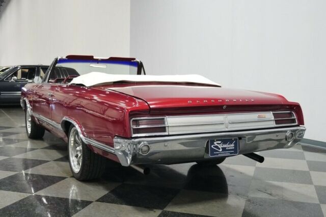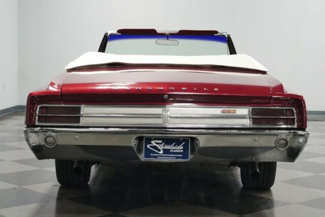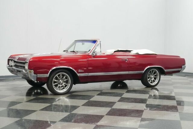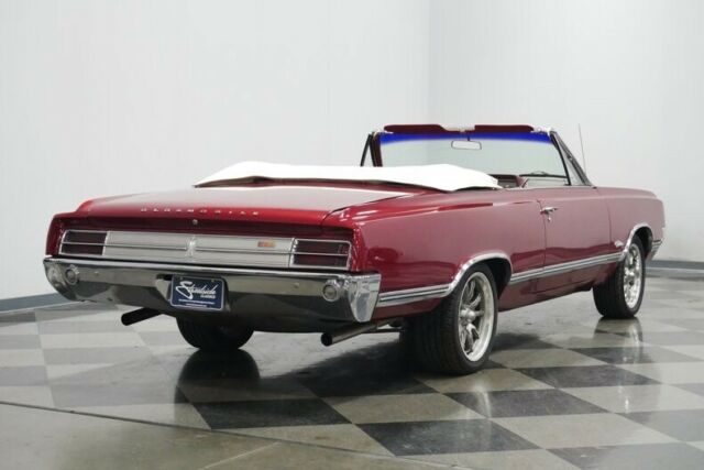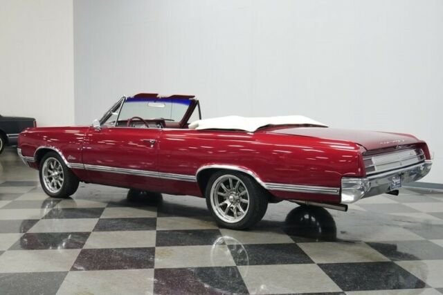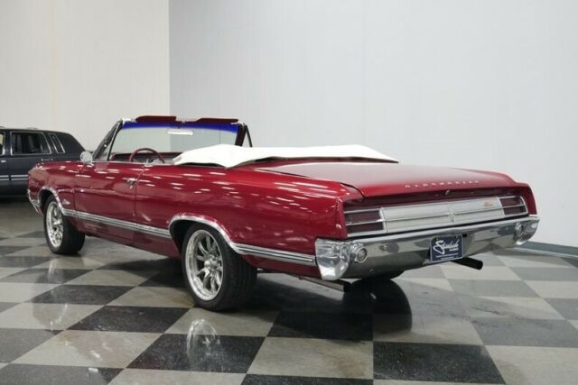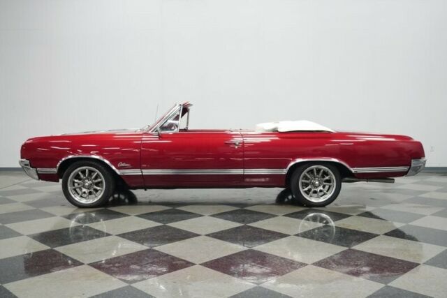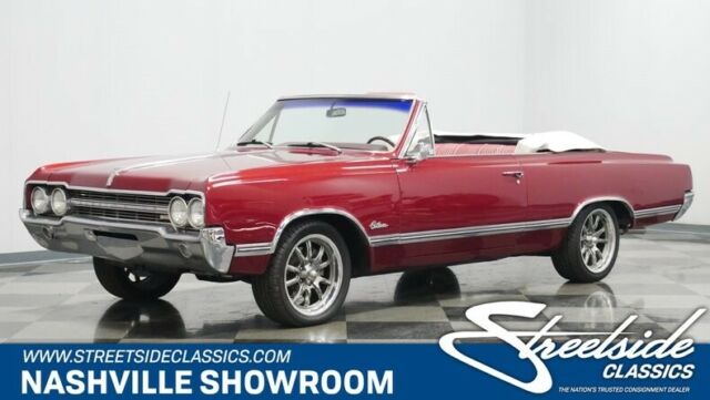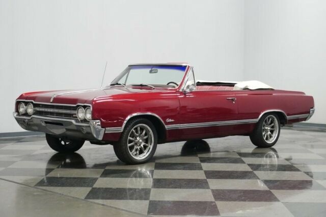 This 1965 Oldsmobile Cutlass 442 is wolf in wolf's clothing. That's because while you know a 442 is already performance car, this one has a larger V8, fuel-injection, four-wheel disc brakes, a four-speed auto, and plenty more upgrades. It makes for a true classic that truly knows how to hit the streets. We already love this for being a top-level car. Oldsmobile made less than 12,700 drop-top Cutlass in 1965, and that makes this one a rare find over half a century later. These have stand-out styling with full-length trim, crisp sheetmetal, and chrome bumpers that hug the form (a true Olds hallmark during this golden era.) This one really upholds that style nicely with a quality look. And the factory-correct Target Red paint sets the right tone for the more aggressive 442. Plus, the badging and dual exhaust have the right muscle car attitude, and the upgraded Ridler wheels hint at big investments beneath the skin. This white convertible top has a premium style, but with the flip of a switch, it powers down to reveal an even more impressive interior. After all, red interiors are the perfect way to showcase performance and sophistication all in the first glance: and that's what the Olds 442 was all about. Bucket seats, a center console, auxiliary gauges, and Oldsmobile's four-spoke sports steering wheel are all part of a package designed to be a great driver. The engine bay looks clean, tidy, and absolutely mean. After all, the golden glow of the Olds V8 is a special style that continues this car's performance and premium presentation. The first "4" in the 4-4-2 designation for 1965 meant 400 cubic-inches, but this one does it better. It has a later 455ci powerhouse. And not only do you have added displacement for more power, but this is also topped with a modern FAST electronic fuel injection system. It maximizes the power and consistency of this big V8. Plus, you'll just love the rumble of the header-fed X-pipe dual exhaust. There's also an MSD ignition, serpentine belts, and an aluminum radiator w/electric fan in this total quality setup. Because this Olds is both a performer and a cruiser, you have nice driving features, like power steering, sway bars front & rear, newer busing, and four-wheel power disc brakes. And the 700R4 four-speed automatic transmission is a stout unit that makes it easy to cruise near or far thanks to overdrive. This rare Olds 442 drop-top is also an awesome fuel-injected total package machine. So you know it's hard to resist this upgraded muscle car convertible. Call today!!! |