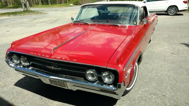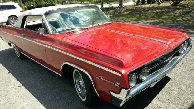 | 1964 Oldsmobile Dynamic 88 Convertible With a 280hp and dual exhausts. Excellent condition with power brakes, power windows and seats and a rare factory air conditioner for a convertible in that time frame. Rust free and leak free with no rips of any kind on seats and top. |
