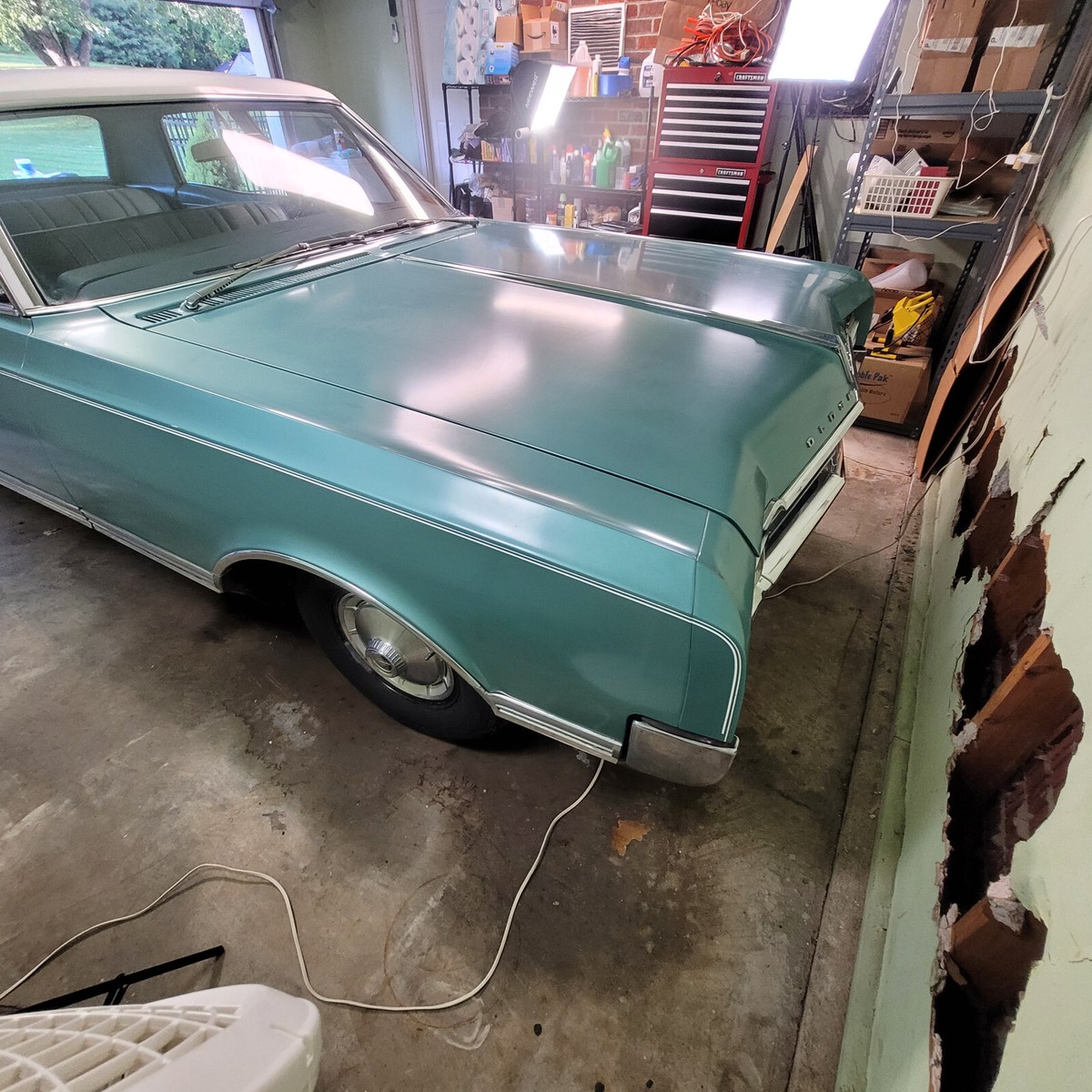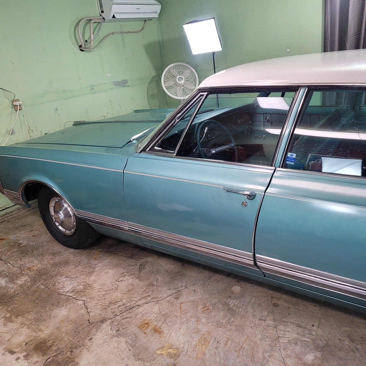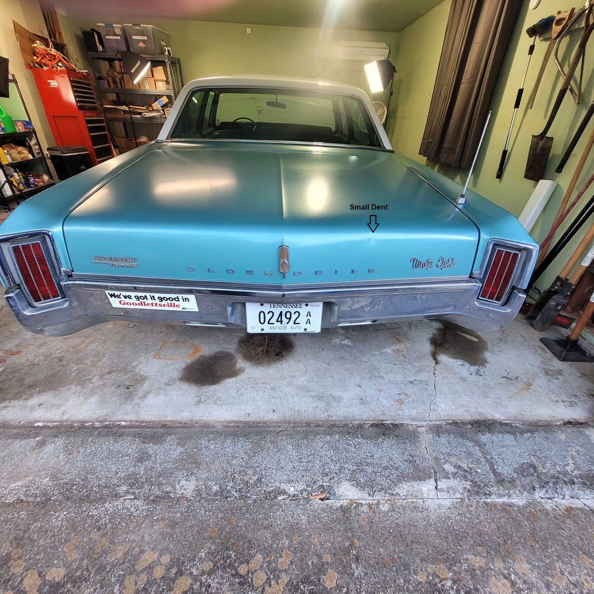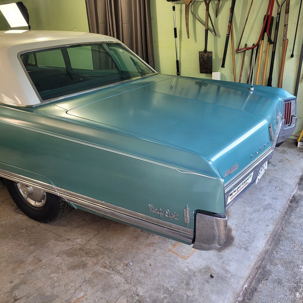 1965 Oldsmobile Ninety-Eight Hardtop Luxury Town Sedan - Original & Highly Original - RWD - Engine Type: V8, 425 cu in - Automatic Transmission - Assembly Plant: Lansing, Michigan - Color: Ocean Mist (turquoise) with White Top. Purchased new at Hippodrome Oldsmobile, Nashville, Tennessee, July 1965 by a family uncle for his wife, who mostly drove it locally in the Nashville area - When not in use, the car has been housed in the same garage when not in use since the day it was purchased - No Accidents - Mileage on the odometer: 124,240 - Car is not in driveable condition. It has not been driven since 2004. The body of the vehicle is in good shape for its age with minor rust and a small dent in the rear - car's chrome is in good shape - original hubcaps. This car has only had two owners, my wife and her uncle. This vintage car is rare; it is just awaiting restoration. Notes: (1) The car has not been driven since 2004. It ran well before that time. When not in use, the car was kept in a garage, but the garage was not heated most of the time. I'm not sure this is an issue, but the car was exposed to the cold weather in Tennessee, and the existing antifreeze may have gone bad. (2) We are unable to open the trunk. We have the trunk key, and the key turns, but the trunk does not open. My wife's uncle kept his Tom's Peanut signs in the trunk, and they may have interfered with the opening hardware when the trunk was closed. (3) There is a small dent in the trunk. Shown in photo. (4) The interior is worn. Shown in photo. (5) A rust spot on the driver's side close to the rear tire. Shown in photo. (5) A rust spot on the passenger's side at the rear window. We have a YouTube video with more details. This video is a complete walk-around of the car, including its interior. Copy and Paste linkinto a browser:https://youtu.be/IRdQ9HGYPX8?si=23-vYrXYyxk1wKP-
