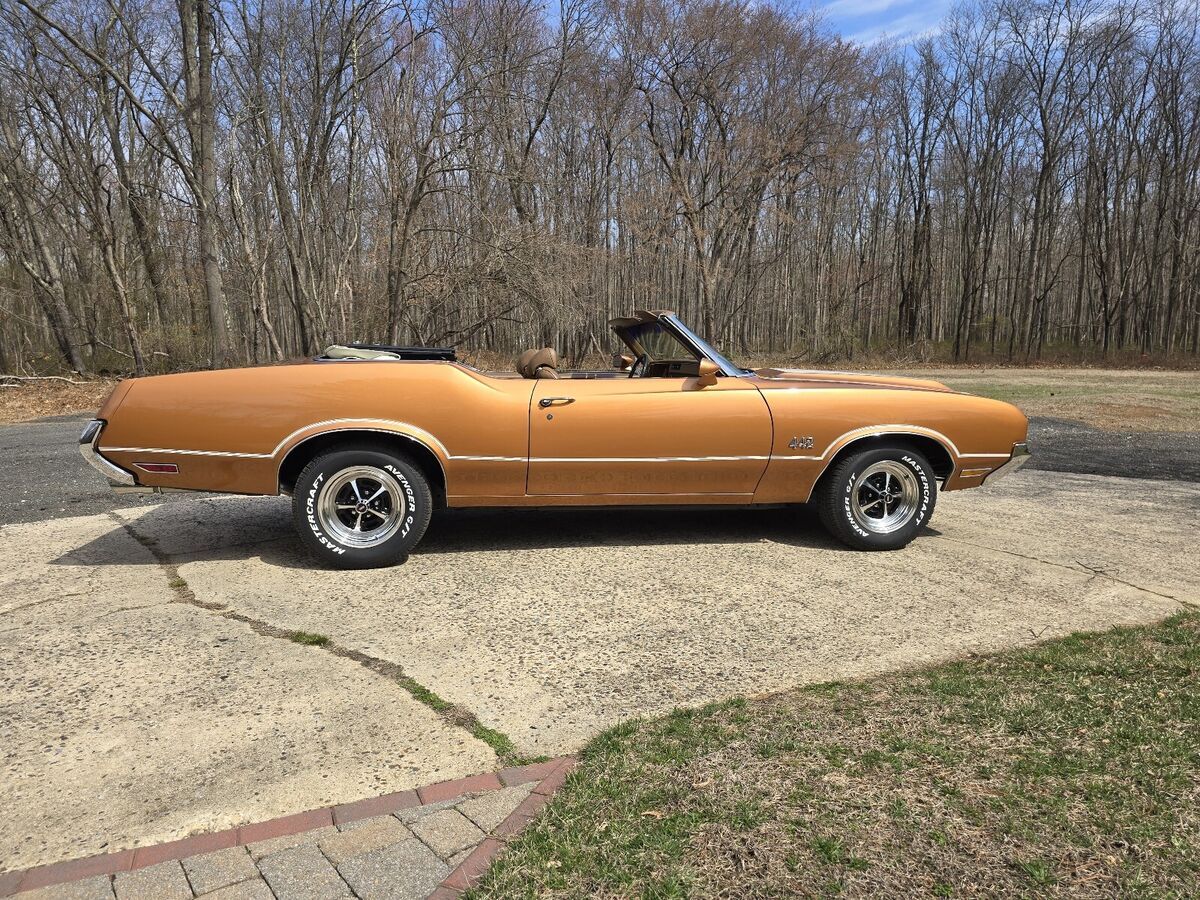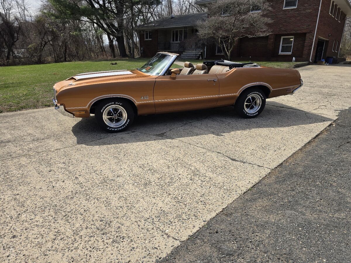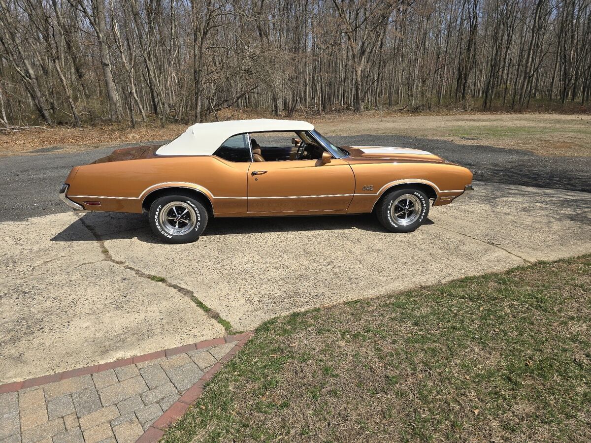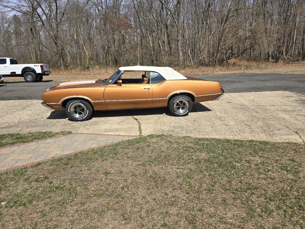 1972 442 convertible number matching car frame off restoration. High option car Vehicle Details 1972 442 convertible number matching350 auto factory rally gages. Power windows. Sport mirrors. His and her shifter power, top power, steering power breaks cold air conditioning. Tilt steering sport wheel. Trunk, light. This vehicle is gone, threw a full frame off restoration, complete new rebuilt drive train frame. Was blasted and painted original floors, original trunk. Has original panels? The underside of car was blasted body shoults and clear coded. Original color saddle bronze, beautiful, new white legendary interior I did not install the door handles straps because I'm not sure if somebody would like them off before I put holes in the legendary door panels. I can easily install them. For buyer. The complete interior is new. Right down to the floor mats. Everything works as should. It has original am f from radio that is not hooked up. But works because I paid a lot of money for that. Beautiful -, no cracks, all new green tinted glass. New key convertible, top with glass window, new cylinders, new lies and convertible motor. Very quiet, going up-and-down. The body was stripped and repainted. It's base coat, clear coat, color sanded to show quality. I added a new Thornton hood with Ram air. It comes with or without the rear spoiler, but I did not put it on because the convertible did not come with A. Rear wing. So before I put a hole in the trunk, it's up to the buyer. All new Chrome, all new lenses, new grill, assemblies. Or weather stripping, window felts all replaced, including convertible tap rubber. Complete new suspension, including all new control, arms, uppers and lowers front and rear boxed in rear. All new stainless brake system, all new fuel system. K y b gas shocks, new coil springs, complete front end steering suspension new new thornton exhaust manifolds with pypes 2 1/1 stain, the steel exhaust system. Upgrade it to new 15" polished aluminum ss1 wheels, new tires also come with original 14" inch wheels the car runs beautiful and extremely tight, just under1000 miles on complete restoration as you can see in the pictures. The car speaks for itself and done right? This is a beautiful show. Car ready to be enjoyed. Or take it to car shows the trunk was nicely. Splatter, painted with brand new spare Jack assembly. If you have any questions or offers, you can contact me at 732 742 2793 i'll answer any and all questions that you have if you have under 50 positive feedbacks contact me before bidding on this car or I will have you removed. This is an auction. make sure you have the money and funds available before you bid. I'll work with buyer to get them. The best shipping rates. Fire is responsible for shipping. I'll help out in any way. Car will be safely stored inside until picked up. This is a very nice investment. Good luck with bidding.Dave |