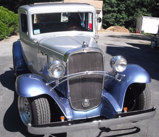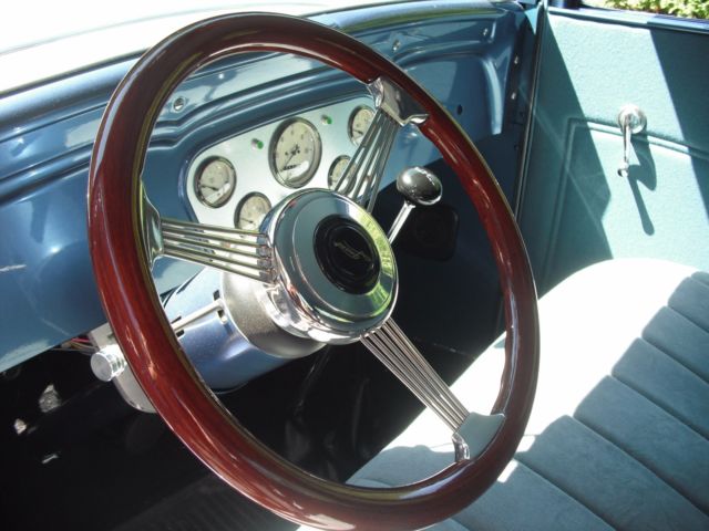 | 1932 Chevy Confederate, all steel body, 350 small block, Edelbrock intake carb, headman headers, 350 turbo trans, all steel, mustang II front end, tubular frame coilovers, 10 bolt rear, pwr brakes, painless wiring, am-fm radio, Lokar shifter, Ididit column, Grant walnut steering wheel, Autometer gauges, Hampton coach interior, new wood frame, new glass, silver steel body, blue steel fenders, fully restored in and out. certified appraisal available. |