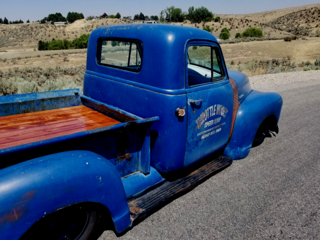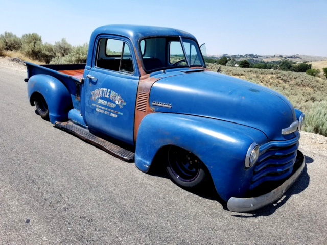 Wilder project is complete! We are super excited about the final product! Yet another Excellent example of old school body lines meets modern drivetrain with a TW twist. This truck has been built by enthusiasts with enthusiats in mind. With the custom color interior and custom patina on the exterior, we are positive you'll turn heads wherever you go. This 1953 sits on an s-10 chassis with a custom air ride kit, that combined with some 15x10 wheels gives it a low, tough, look that you and everyone else in the parking lot wont be able to stop looking at. Mother nature and a few owners along the way have had their way with the exterior of the truck giving it a "patina/ratrod/grafitti" look that is definitely one of a kind and pretty dang cool.. On the inside you will find a comfortable bench seat and a part from some new electronic gauges, a simple and clean yet functional interior, as intended by Chevy when they produced them. All and all a great running, driving and looking truck that should give you many miles of fun and even more smiles from yourself and many others. On top of all of that another great part about this truck is you can go anywhere. With the GM 5.3 engine, 4 speed 4L60 transmission and Chevrolet S10 frame and suspension parts are plentiful and available at your local parts store. So whether your looking for a daily driver or a weekend cruiser, this truck will fit your needs and wants. 1953 Chevy Chevy S10 frame2001 5.3L Chevy Vortec motor4L60E 4-speed automatic transmissionComplete new body harness and fuse panelProfessionally modified drivetrain harness.TW built custom engine and transmission mountsFull air bag suspension15x10 wheels all the way around. New front and rear tires.New bed wood and stainless strips. Drives right when bags are aired up, lays boards on the ground when parked. What else could you ask for?? For sale locally, auction may end early. Text or Call 208-869-3329 with any questions. Thank you.Throttle Works |