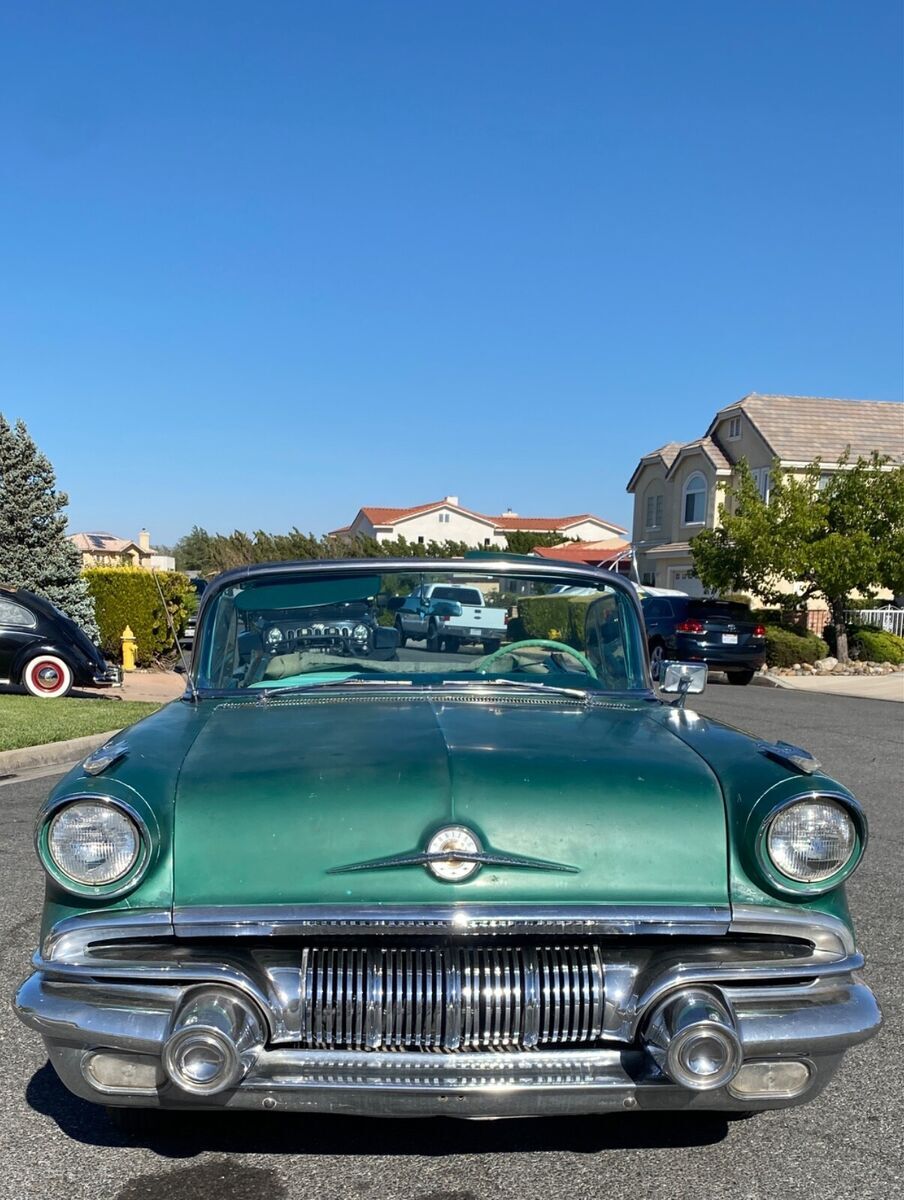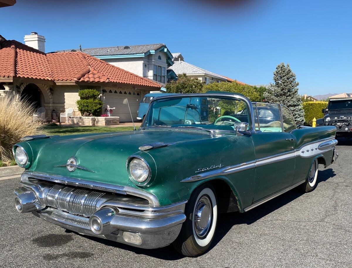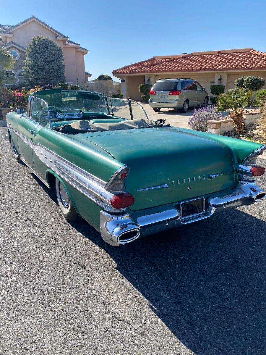 HIS CAR WAS PREVIOUSLY LISTED AND SOLD 2X HOWEVER BOTH TIMES THE BUYERS FAILED TO PAY. SO WE ARE GOING TO TRY THIS AGAIN. SO PLEASE DO NOT BUY IT NOW OR MAKE AN OFFER UNLESS YOU CAN PAY.THIS IS A 1957 PONTIAC STAR CHEIF CONVERTIBLE.THE CAR IS REALLY NICE, MY DAD IS JUST OLDER AND DOESNT GET AROUND LIKE HE USE TO SO I AM HELPING HIM SELL SOME OF HIS CARS.IT HAS A V8 WITH A HYDROMATIC TRANSMISSION, POWER STEERING, RUNS AND DRIVES VERY SMOOTH AND QUIET.THE EXTERIOR IS AN OLDER REPAINT IN A DARKER GREEN THAN THE ORIGINAL COLOR. HOWEVER, IT IS A ORIGINAL 57 PONTIAC COLOR. THE PAINT HAS SOME LIGHT ISSUES (FADING, CRACKING, SMALL DIGS) NOTHING TOO MAJOR WILL DEFINATELY CLEAN UP WITH A LITTLE WORK. HAS NO VISUAL SIGNS OF MAJOR REPAIRS FROM ACCIDENTS OR RUST THAT I CAN SEE. EXTERIOR STAINLESS SUPER CLEAN AND STRAIGHT. BUMPERS STILL SHINE UP AND ARE STRAIGHT FOR BEING ORIGINAL. ALL GLASS IS GOOD AND ROLL UP AND DOWN AS THEY SHOULD.THE INTERIOR IS AN ORIGINAL 2 TONE GREEN IN GOOD CONDITION - 1 SMALL SPOT WHERE THE SEEM IS COMING APART ON THE DRIVER SIDE - A COUPLE INCHES LONG.DASH LOOKS GREAT AND EVERYTHING WORKS, HOWEVER, TO BE HONEST I AM UNSURE OF THE RADIO WORKING CORRECTLY. CHROME IS NICE.TOP IS OLD, COULD BE REPLACED HOWEVER, STILL WORKS GOOD.SOLID TRUNK AND FLOORS.MOTOR COMPARTMENT REALLY CLEAN SEE PICTURES.SEE ALL PICTURES FOR BEST DESCRIPTION. PLEASE FEEL FREE TO ASK QUESTIONS AND I WILL ANSWER THE BEST THAT I CAN.BUYER WILL BE RESPONSIBLE FOR SHIPPING BUT I CAN HELP WITH ARRANGING TO MEET WITH A DRIVER.