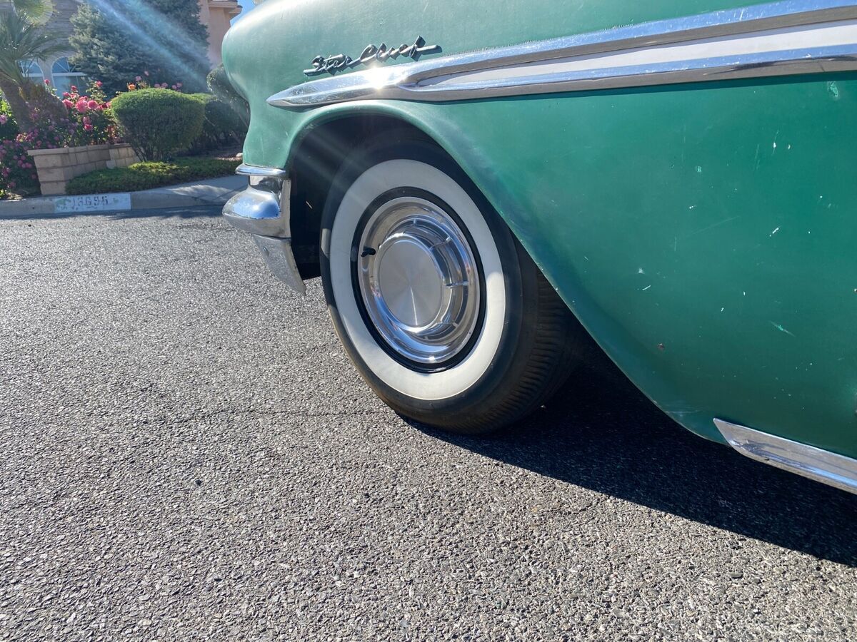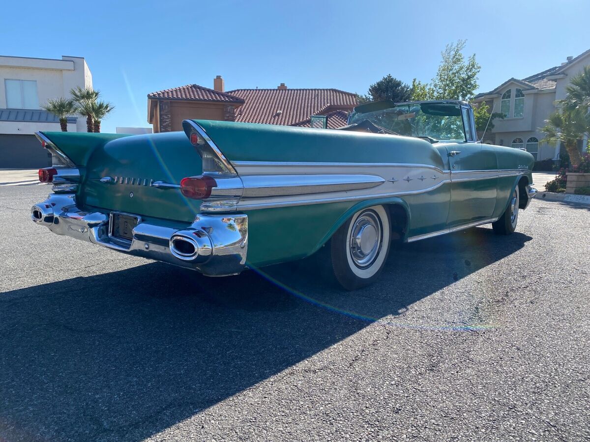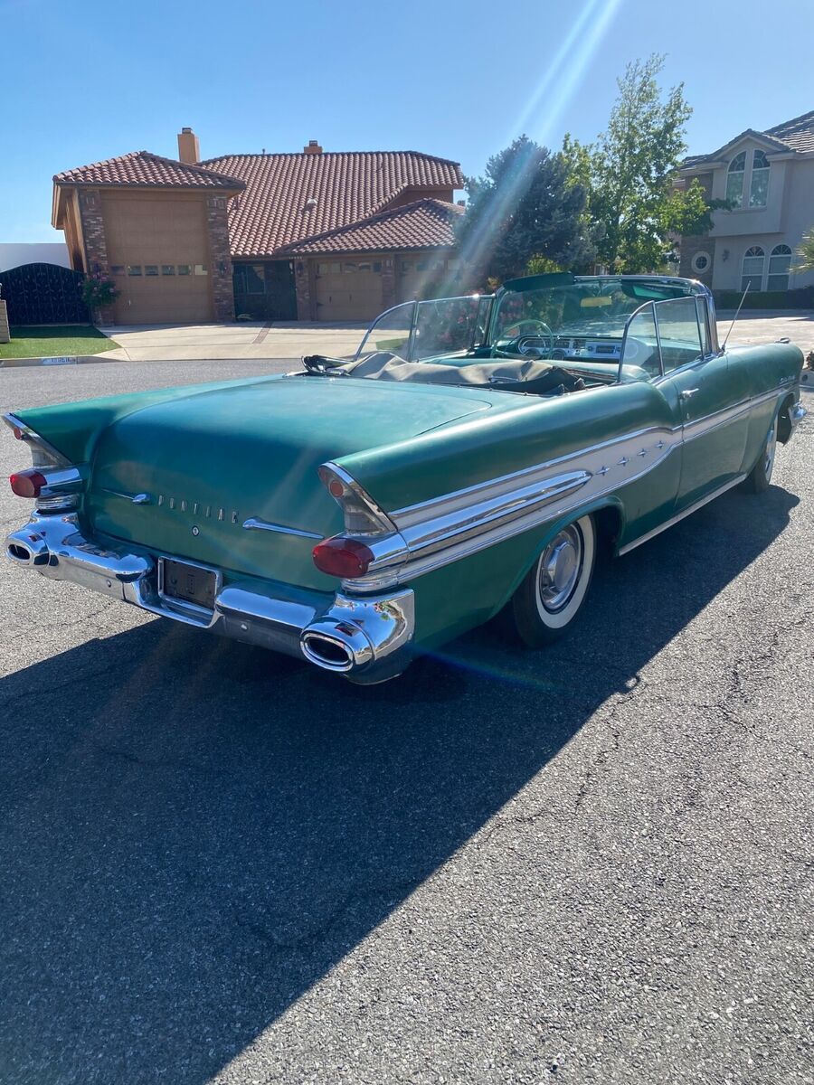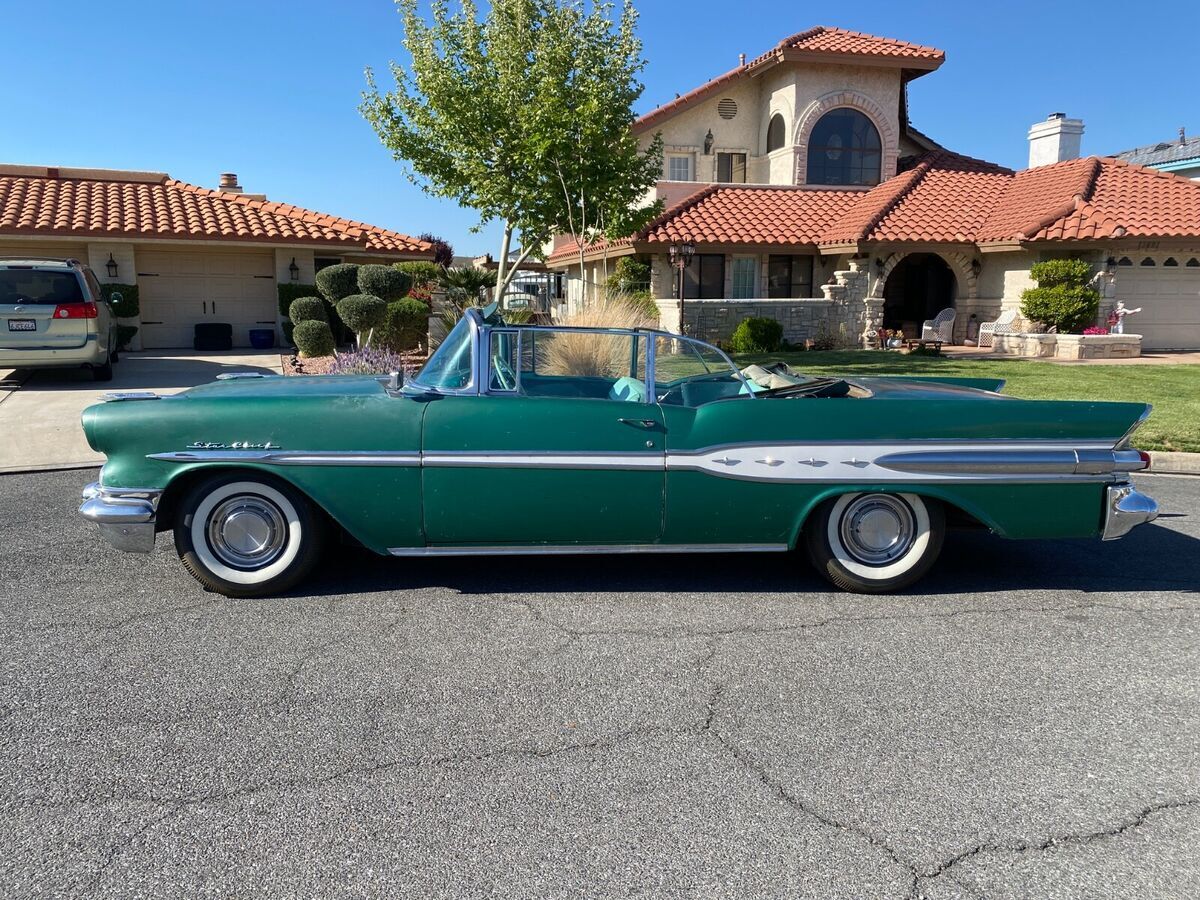 HIS CAR WAS PREVIOUSLY LISTED AND SOLD 2X HOWEVER BOTH TIMES THE BUYERS FAILED TO PAY. SO WE ARE GOING TO TRY THIS AGAIN. SO PLEASE DO NOT BUY IT NOW OR MAKE AN OFFER UNLESS YOU CAN PAY.THIS IS A 1957 PONTIAC STAR CHEIF CONVERTIBLE.THE CAR IS REALLY NICE, MY DAD IS JUST OLDER AND DOESNT GET AROUND LIKE HE USE TO SO I AM HELPING HIM SELL SOME OF HIS CARS.IT HAS A V8 WITH A HYDROMATIC TRANSMISSION, POWER STEERING, RUNS AND DRIVES VERY SMOOTH AND QUIET.THE EXTERIOR IS AN OLDER REPAINT IN A DARKER GREEN THAN THE ORIGINAL COLOR. HOWEVER, IT IS A ORIGINAL 57 PONTIAC COLOR. THE PAINT HAS SOME LIGHT ISSUES (FADING, CRACKING, SMALL DIGS) NOTHING TOO MAJOR WILL DEFINATELY CLEAN UP WITH A LITTLE WORK. HAS NO VISUAL SIGNS OF MAJOR REPAIRS FROM ACCIDENTS OR RUST THAT I CAN SEE. EXTERIOR STAINLESS SUPER CLEAN AND STRAIGHT. BUMPERS STILL SHINE UP AND ARE STRAIGHT FOR BEING ORIGINAL. ALL GLASS IS GOOD AND ROLL UP AND DOWN AS THEY SHOULD.THE INTERIOR IS AN ORIGINAL 2 TONE GREEN IN GOOD CONDITION - 1 SMALL SPOT WHERE THE SEEM IS COMING APART ON THE DRIVER SIDE - A COUPLE INCHES LONG.DASH LOOKS GREAT AND EVERYTHING WORKS, HOWEVER, TO BE HONEST I AM UNSURE OF THE RADIO WORKING CORRECTLY. CHROME IS NICE.TOP IS OLD, COULD BE REPLACED HOWEVER, STILL WORKS GOOD.SOLID TRUNK AND FLOORS.MOTOR COMPARTMENT REALLY CLEAN SEE PICTURES.SEE ALL PICTURES FOR BEST DESCRIPTION. PLEASE FEEL FREE TO ASK QUESTIONS AND I WILL ANSWER THE BEST THAT I CAN.BUYER WILL BE RESPONSIBLE FOR SHIPPING BUT I CAN HELP WITH ARRANGING TO MEET WITH A DRIVER.