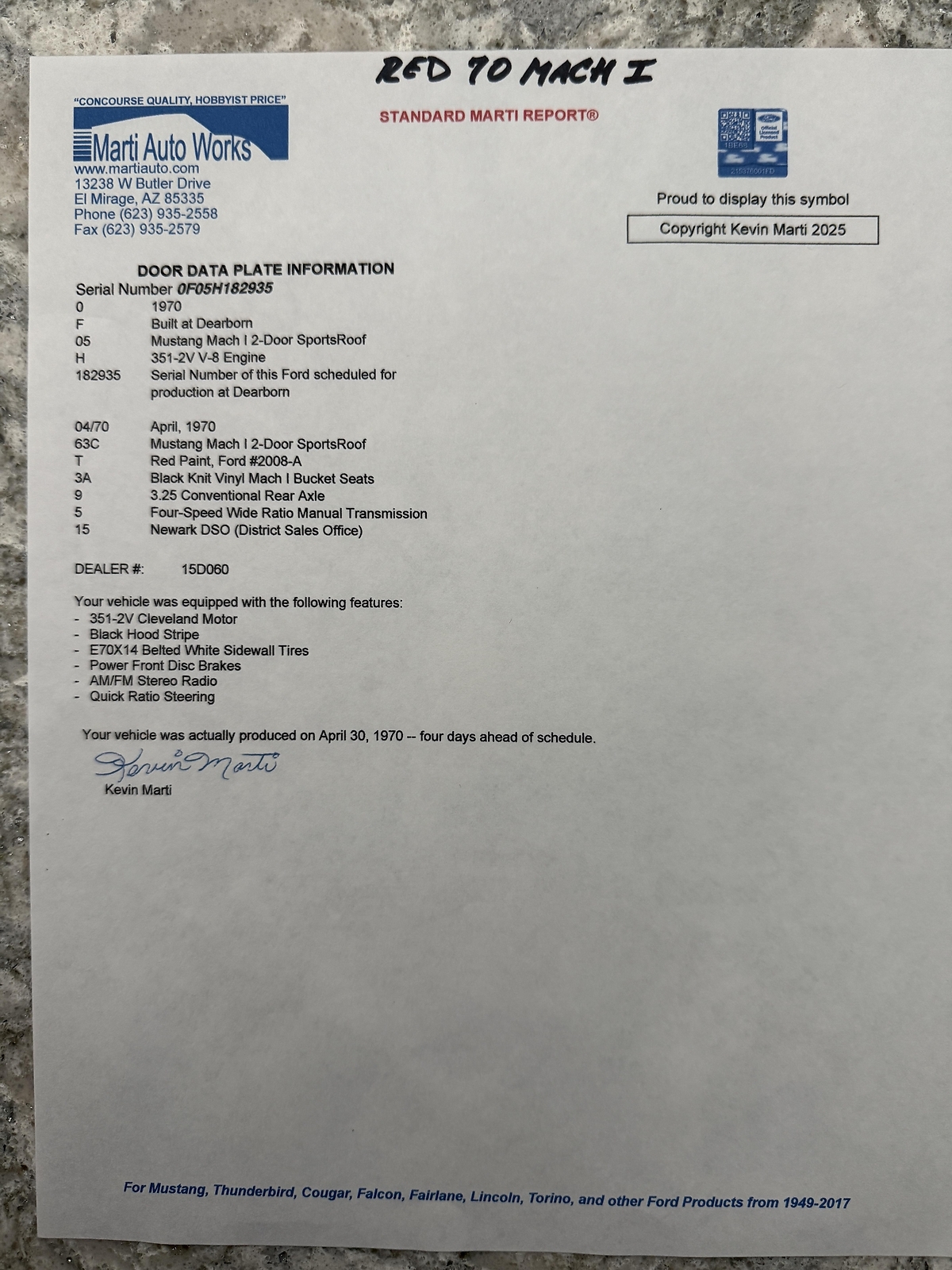 Vehicle Original VIN : 0F05H182935 IF INTERESTED TO BUY OUTRIGHT ANYTIME OR ANY QUESTIONS...... PLEASE EMAIL ... OR CALL 513-615-5755 SUPER SHARP WELL OPTIONED AND FULLY DOCUMENTED WITH MARTI REPORT 1970 MUSTANG MACH 1 351 CLEVELAND FACTORY 4SPD PS PDB REAR LOUVERS SPOILERS SOLID & STRAIGHT METAL FACTORY CORRECT CANDY APPLE RED WITH BLACK BUCKETS CONSOLE INTERIOR VERY WELL KEPT FACTORY CORRECT MACH 1, EXCEPT FOR FEW UPGRADED OPTIONS ADDED JUST HAS THE AWESOME TIGHT ORIGINAL WELL KEPT HIGH INTEGRITY FEEL THATS VERY HARD TO FIND!! VERY DESIRABLE FACTORY 4SPD CAR…STILL HAS ITS FACTORY ORIGINAL HURST SHIFTER WITH REVERSE LOCK OUT STILL HOOKED UP AND WORKING FULLY SORTED COMPLETE TURNKEY CAR….READY TO ENJOY! FULLY DOCUMENTED WITH ORIGINAL DOOR LABEL, ORIGINAL BUCK TAG AND MARTI REPORT EASY STARTING AND GREAT RUNNING ORIGINAL 351 CLEVELAND ENGINE WITH UPGRADED 4BBL CARBURATOR ORIGINAL 4 SPEED TRANS AND ORIGINAL HURST SHIFTER AND ORIGINAL HURST T-HANDLE ORIGINAL 9” REAR END WITH 3.25 GEARS NICELY DETAILED ENGINE AND FACTORY CORRECT ENGINE BAY CORRECT FACTORY BLUE SNORKEL AIR CLEANER WITH ORIGINAL HEAT TUBE DESIRABLE FACTORY COLOR CANDYAPPLE RED CAR WITH BLACK BUCKETS & CONSOLE STARTS, RUNS AND DRIVES BEAUTIFULLY WELL OPTIONED: ? FACTORY MACH-1 ? FACTORY 351 CLEVELAND ENGINE ? FACTORY 4SPD ? FACTORY HURST SHIFTER WITH REVERSE LOCKOUT STILL WORKING ? BLACK KNIT VINYLE MACH-1 BUCKETS ? FACTORY CENTER CONSOLE ? FULL SET OF FACTORY SEAT BELTS ? 9” REAR AXLE WITH 3.25 GEARS ? POWER QUICK RATIO STEERING ? FACTORY RIM BLOW STEERING WHEEL..WORKS PERFECTLY ? FACTORY AM-FM STEREO RADIO FACTORY MACH 1 CLOGK…WORKS AS IT SHOULD ? POWER DISC BRAKES ? MACH-1 FRONT SPORT LIGHTS WITH CORRECT SWITCH…WORK PERFECTLY ? FACTORY STYLE REAR LOUVERS ? TRIP ODOMETER ? FRONT AND REAR SPOILERS BEAUTIFUL CHROME MAGNUM 500 WHEELS WITH BF GOODRICH RADIAL TA TIRES PERFECT LOOK AND STANCE! SUPER STRAIGHT AND SOLID BODY…LOOKS TO BE ORIGINAL METAL…EXCELLENT GAPS AND FIT!…DOORS, TRUNK AND HOOD OPEN AND CLOSE PERFECTLY FACTORY CORRECT CANDYAPPLE RED PAINT..BUFFED SMOOTH…DEEP COLOR AND SHINE EXCELLENT FACTORY MACH-1 ROCKER TRIM PANELS EXCELLENT REAR HONEYCOMB PANEL EXCELLENT REAR TAIL LIGHT BEZELS FACTORY HOOD SCOOP WITH TURN SIGNALS IN REAR OF SCOOP….THEY WORK AS THEY SHOULD FACTORY CHROME TWIST STYLE HOOD PINS SOLID EXCELLENT AND CLEAN UNDERSIDE AND FLOORS SOLID EXCELLENT TRUNK…DETAILED WITH ORIGINAL CORRECT TRUNK MAT EXCELLENT BLACK MACH-1 BUCKETS AND CONSOLE INTERIOR EXCELLENT DELUXE MACH-1 DOOR PANELS EXCELLENT CARPET AND HEADLINER EXCELLENT DASH PAD VERY NICE DOCUMENTED WELL OPTIONED 70 MACH-1 RUNS AND DRIVES TIGHT….. VERY GOOD WELL KEPT CAR FOR LINK TO MANY MORE DETAILED PICTURES OF THIS CAR PLEASE EMAIL.. OR CALL 513-615-5755 FOR WALK AROUND VIDEO OF THE CAR RUNNING PLEASE CALL 513-615-5755 CALL DAN 513-615-5755 OR EMAIL WITH ANY QUESTIONS AND/OR OFFERS ON THE CAR EASY FINANCING IF NEEDED THRU JJ BEST FOR FINANCING CALL CHRIS @ 508-415-1035 THIS IS A VERY NICE QUALITY HARD TO FIND SO WELL KEPT…… LONG TERM PREVIOUS OWNER. EVERYTHING WORKS…EVEN THE MACH 1 FACTORY CLOCK WORKS!……TURNKEY READY TO ENJOY! FOR LINK TO MANY MORE DETAILED PICTURES OF THIS CAR PLEASE CALL 513-615-5755 FOR WALK AROUND VIDEO OF THE CAR RUNNING PLEASE CALL 513-615-5755 PLEASE EMAIL OR CALL 513-615-5755 WITH ANY QUESTIONS IF YOU NEED SHIPPING I HAVE A SHIPPING SOURCE THAT HAS VERY REASONABLE RATES AND SHIPS IN A TIMELY MANNER. IF YOU NEED FINANCING HERE ARE SOME VERY GOOD SOURCES: JJ BEST 1-800-USA-1965 TERMS: Notice To Bidders: High Bidder To Send $800.00 Non-Refundable Deposit Within 24 Hours Of The Close Of This Auction. Funds To Be Paid With Certified Check, Bank Transfer, Or Cash In Person Within 5 Days Of Auction Ending. All Sales Final. Mileage Is Exempt. The Sale Is Subject To The Following Conditions And Representations This Vehicle Is Being Sold As Is, Where Is With No Warranty In Connection Therewith. The Seller Shall Not Be Responsible For The Correct Description, Authenticity, Genuineness, Or Defects Herein, And Make No Warranty In Connection Therewith. No Allowances Or Set Aside Will Be Made On Account Of Any Incorrectness, Imperfection, Defect Or Damage. Any Descriptions Or Representations Are For Identification Purposes Only And Are Not To Be Construed As A Warranty Of Any Type. It Is The Responsibility Of The Buyer To Have Thoroughly Inspected The Vehicle, And To Have Satisfied Himself Or Herself As To The Condition And Value Based Upon That Judgment Solely. Seller Assumes No Responsibility For Any Repairs Regardless Of Any Oral Statements About The Vehicle. May Sell To The Highest Bidder If Reserve Is Not Met And Will Entertain Offers Before End Of Auction. I Reserve The Right To Terminate This Auction At Any Time. Shipping Costs Are The Responsibility Of The Purchaser But I Will Try To Help Anyway I Can. Negative Feedback Bidders Or 5 Feedback Bidders Or Less Please Contact Me Before Bidding. Do Not Bid Unless You Intend To Buy. Thank You And Good Luck! You Are Entering Into A Legal Binding Contract To Purchase The Vehicle Described Above. If You Do Not Intend To Purchase This Item, Do Not Bid! Bidders Must Be Able To Pay Cash Or Have All Loans Pre-Approved Before Bidding On This Vehicle! Unqualified Bidding, Deadbeat Bidding, Or Auction Interference will not be tolerated. Thank You Very Much For Your Understanding. EMAILS TO OR CALL 513-615-5755 THANKS