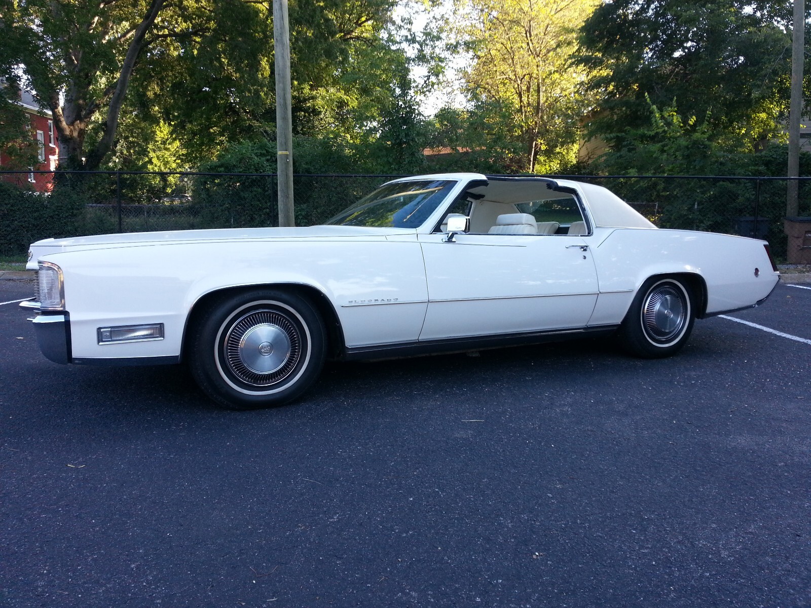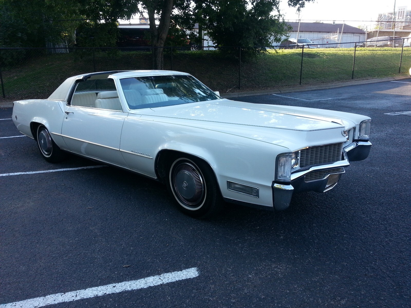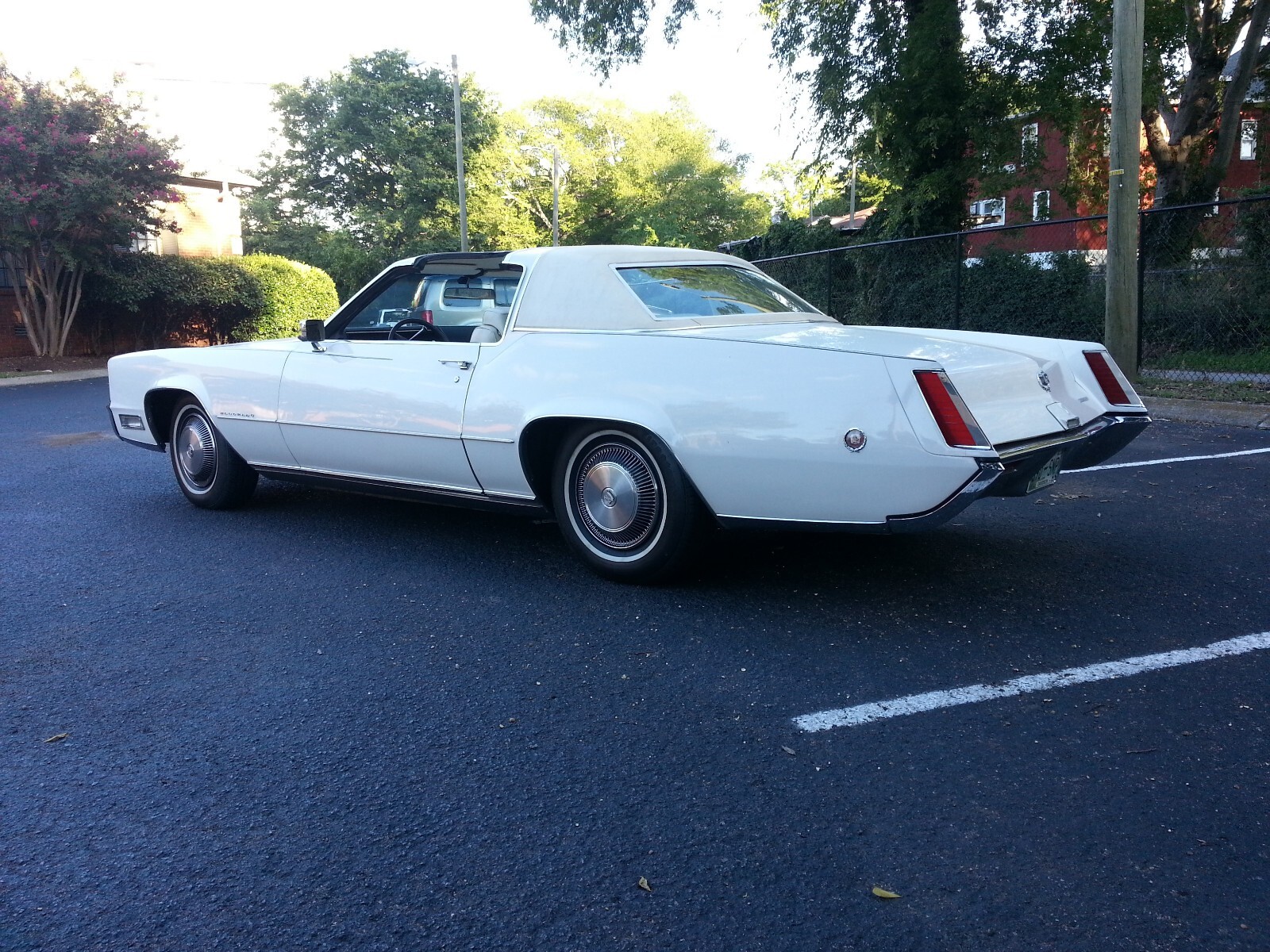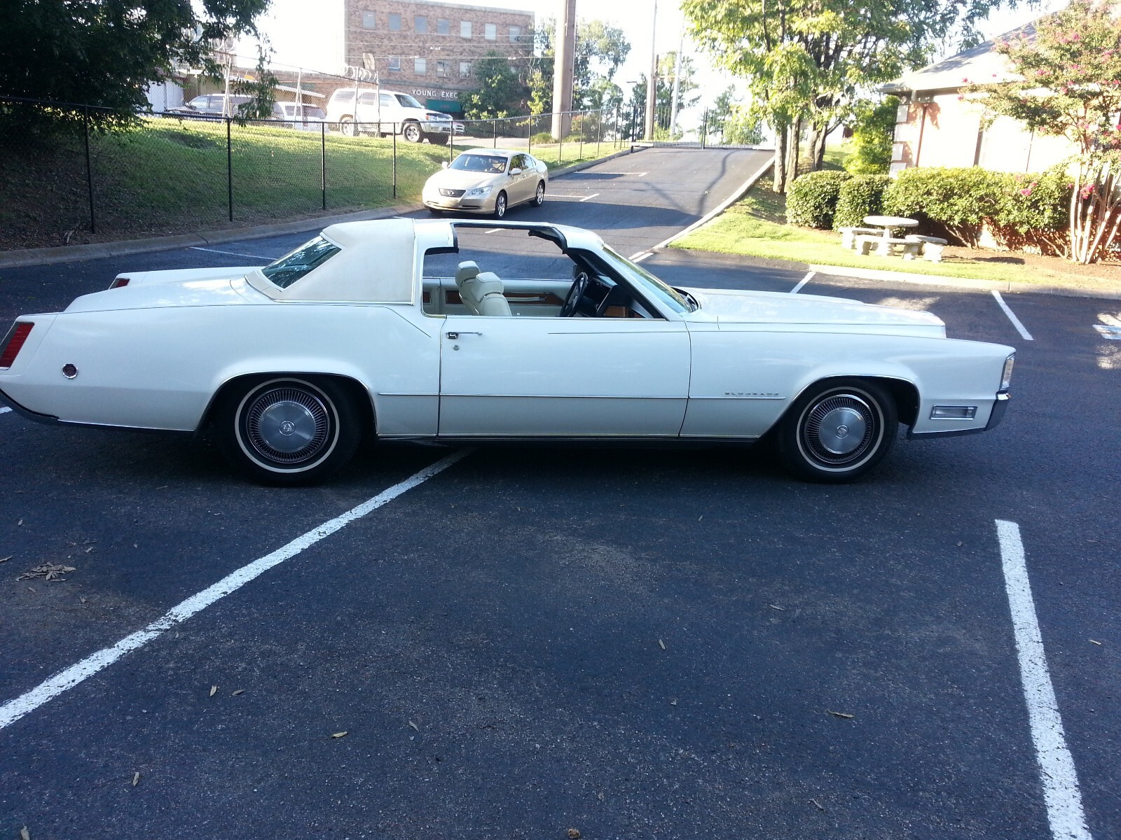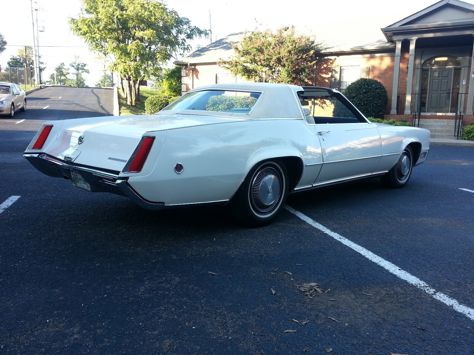 selling my eldo. just getting too old to do it justice. i only drive it about once a month now and sometimes not that often. all my life i've been the typical average person that goes somewhere and no one ever says anything to. i get in this car - and i'm everyone's friend. folks waving. rolling down their windows to talk to me - while driving. people follow me home to discuss the car. i had the garage door open one day and the fedex guy came to my front door, not to deliver a package, but to ask if he could go look at the car. it's not restored. it isn't gonna win a concourse. it's got some niggly issues - tires are 10 yrs old, needs tune-up and maintenance, i think it has an exhaust leak at the manifold (but i'm not a car guy), probably could use a new battery - the one in it is 7 yrs old. i'm guessing i am the third owner. it was in portland oregon with the original buyer from 1969 to 2007(and no rust). then, sold to a person in lebanon, tn. i bought it in jan, 2008. this is the description from the ebay ad when i bought it in january, 2008: RARE DEALER INSTALLED T-TOPS. THIS CAR IS A RARE FIND AND A TRUE PIECE OF AUTOMOTIVE HISTORY. SOLD NEW IN PORTLAND, OREGON AT LEW WILLIAMS CADILLAC ON 2/14/69.THE CADDYS BODY IS NICE AND STRAIGHT WITH ONE REPAINT. THE PAINT IS VERY GOOD OVERALL WITH ONLY THE PASSENGERS QUARTER PANEL SHOWING SOME AGE.(LAQUER CRACKING) THE CHROME AND BRITEWORK ARE ORIGINAL AND ARE IN GOOD SHAPE BUT NEARLY 40 YEARS OLD. (NOT RUSTY OR BENT UP JUST NOT SUPER BRITE) THE ORIGINAL WHITE LEATHER INTERIOR IS VERY GOOD. THE SEATS SHOW MINOR WEAR BUT EVERYTHING ELSE IS A-1 AND ORIGINAL. THE DEALER INSTALLED T-TOPS FIT AND LATCH VERY TIGHT AND ARE NOT LEAKY! THE CAR IS SUPPOSED TO BE 1 OF 15 CARS THAT WERE OPTIONED WITH THIS CONVERSION PER THE PREVIOUS OWNER. THE CAR HAS THE ORIGINAL 472 V8 BACKED BY A 400 TURBO TRANSMISSION. THE CAR IS FURTHER OPTIONED AS FOLLOWS... POWER STEERING,POWER DISC BRAKES, CRUISE CONTROL, TILT WHEEL, POWER WINDOWS, DOOR LOCK, AM/FM STEREO, REAR DEFROST,CLIMATE CONTROL WITH A/C, AUTO DIMMING LIGHTING ELECTRIC TRUNK LATCH AND AN AFTERMARKET 10 DISC CHANGER. EVERYTHING IS IN GOOD WORKING CONDITION ON THE CAR AND EVEN HAS ALL FOUR OF ITS ORIGINAL T-3 HEADLAMPS. THE CAR IS VERY SOLID NO RUST TOP OR BOTTOM EXCEPT AS NOTED IN PICTURE.