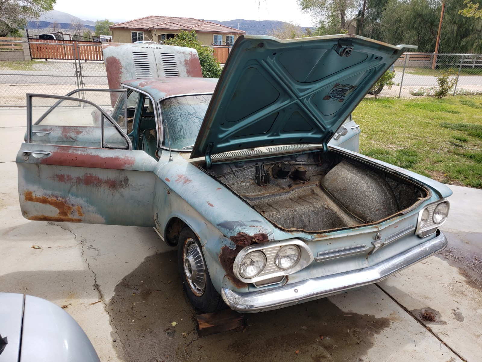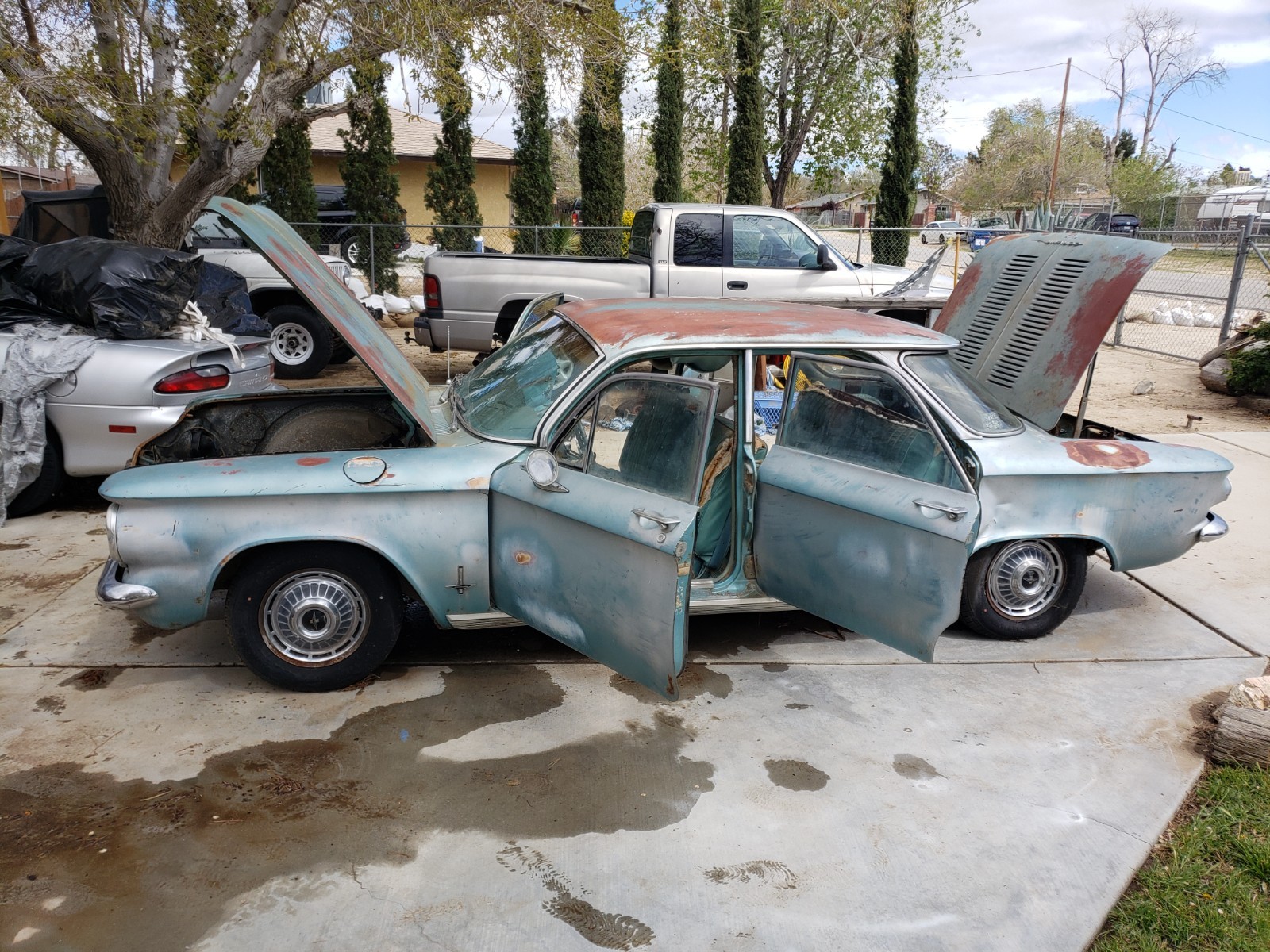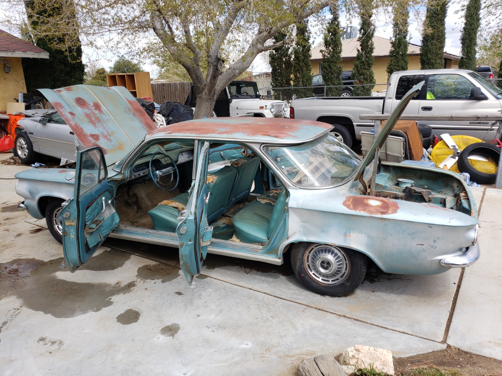 Up for auction a 1962 Corvair Monza 900. The car is complete but being sold "for parts", as I can only offer a bill of sale. The car was purchased from a salvage yard with the intent to restore, but I have too many other projects right now. I have the paperwork from the yard, along with some very old paperwork that was in the car, and I can give you a bill of sale, but you'll have to do your own research if you wish to register it. Otherwise, it'll make a great "parts car". Aside from the dents and dings, it still has some useful body parts, glass is all intact, all the knobs and buttons, engine and tranny, hood, trunk, seat frames, doors (which swing strong) ..., etc. Also has new tires, but some of the rims are dirty which causes air leaks.Please keep in mind, you'll need to bring a trailer, and friends to help load it. The car is being sold "AS-IS", with no guarantees or warranties of any kind. Once the exchange is made, the car is yours. No Returns. Please do your due diligence and ask questions if you have them. I'll get back to you as quickly as I can. I wish you all the best of luck. PS --- Anyone bidding with zero feedback will be quickly scrutinized and deleted if any suspicion of foul play. Not a fan of BS.