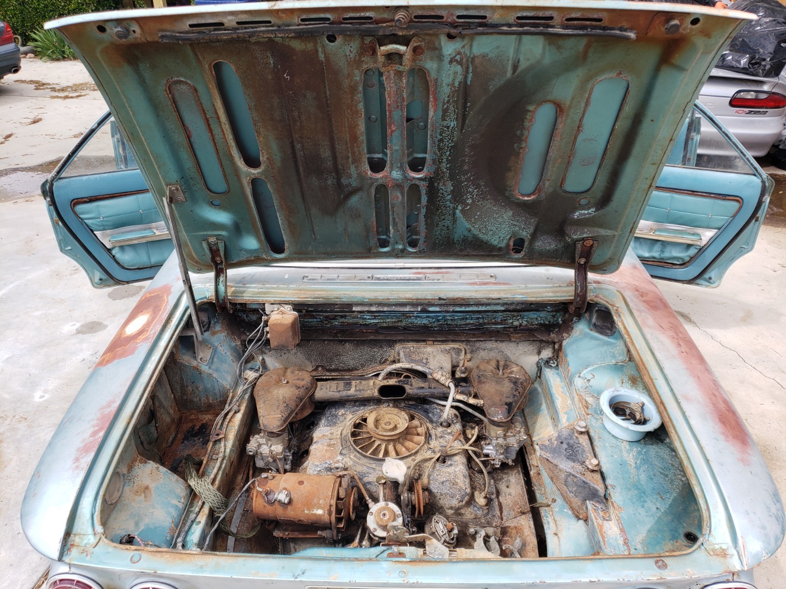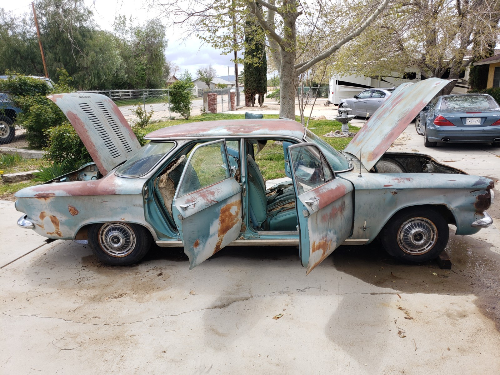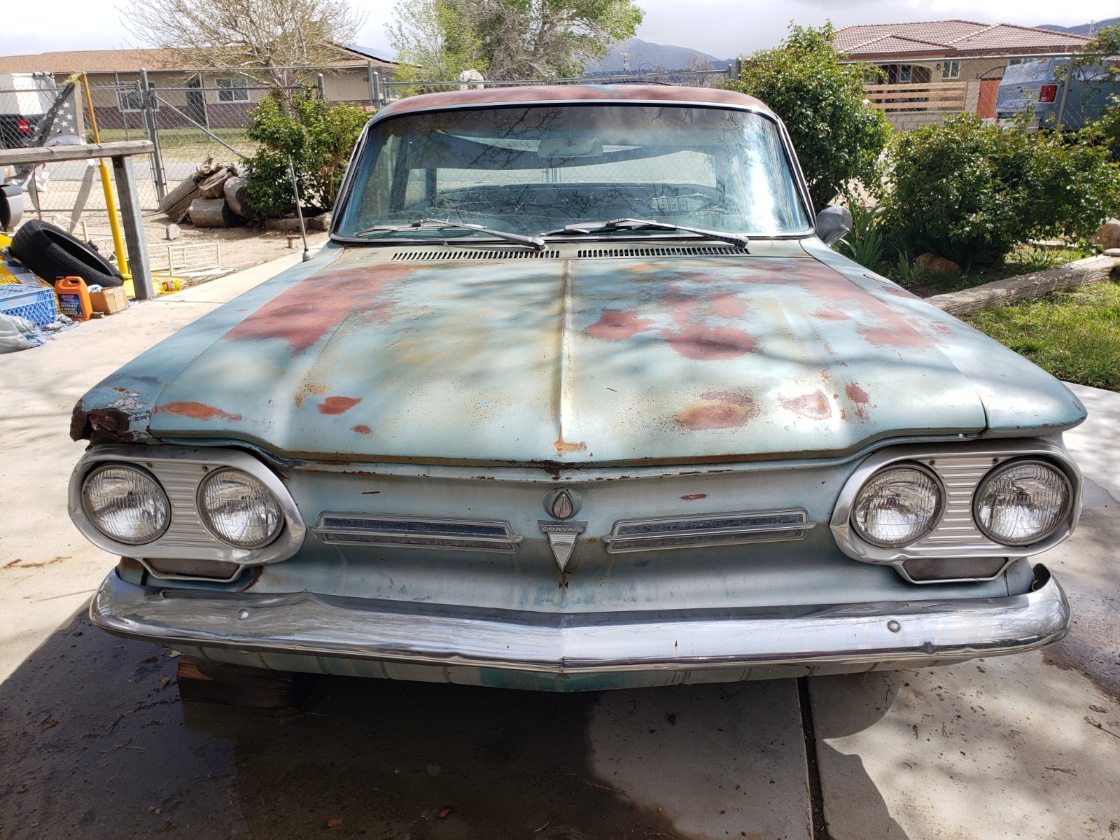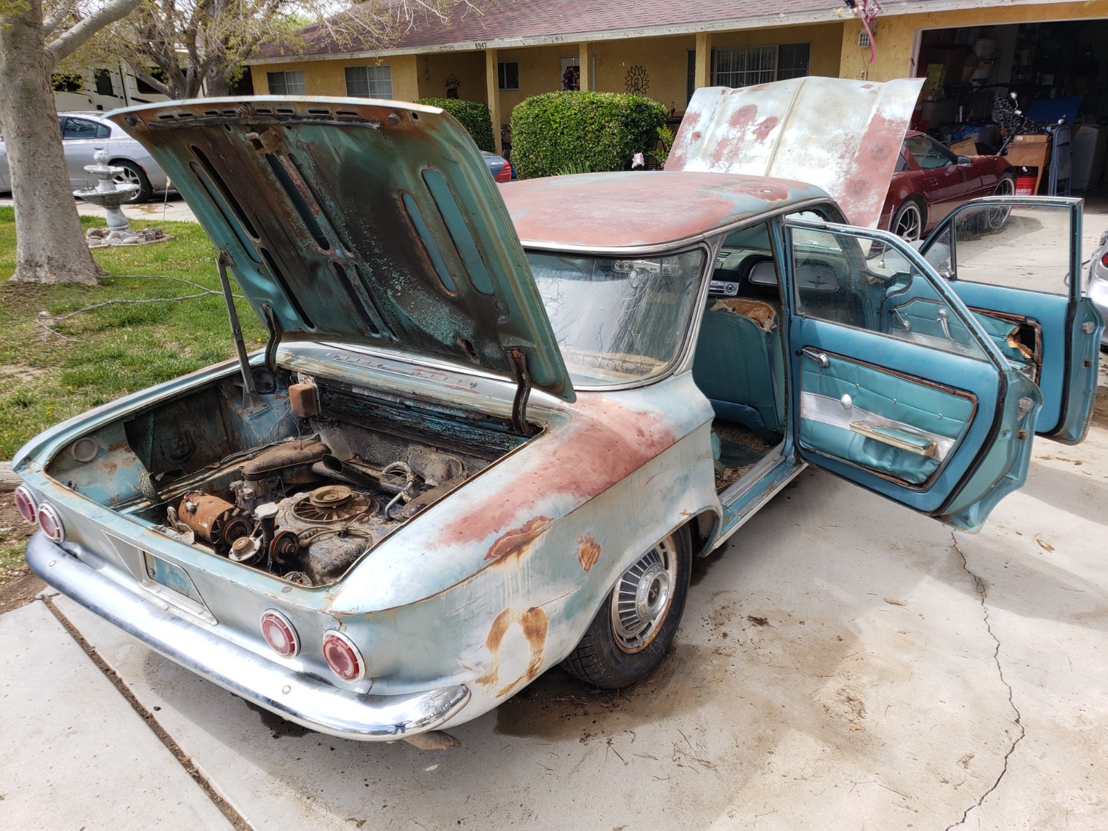 Up for auction a 1962 Corvair Monza 900. The car is complete but being sold "for parts", as I can only offer a bill of sale. The car was purchased from a salvage yard with the intent to restore, but I have too many other projects right now. I have the paperwork from the yard, along with some very old paperwork that was in the car, and I can give you a bill of sale, but you'll have to do your own research if you wish to register it. Otherwise, it'll make a great "parts car". Aside from the dents and dings, it still has some useful body parts, glass is all intact, all the knobs and buttons, engine and tranny, hood, trunk, seat frames, doors (which swing strong) ..., etc. Also has new tires, but some of the rims are dirty which causes air leaks.Please keep in mind, you'll need to bring a trailer, and friends to help load it. The car is being sold "AS-IS", with no guarantees or warranties of any kind. Once the exchange is made, the car is yours. No Returns. Please do your due diligence and ask questions if you have them. I'll get back to you as quickly as I can. I wish you all the best of luck. PS --- Anyone bidding with zero feedback will be quickly scrutinized and deleted if any suspicion of foul play. Not a fan of BS.