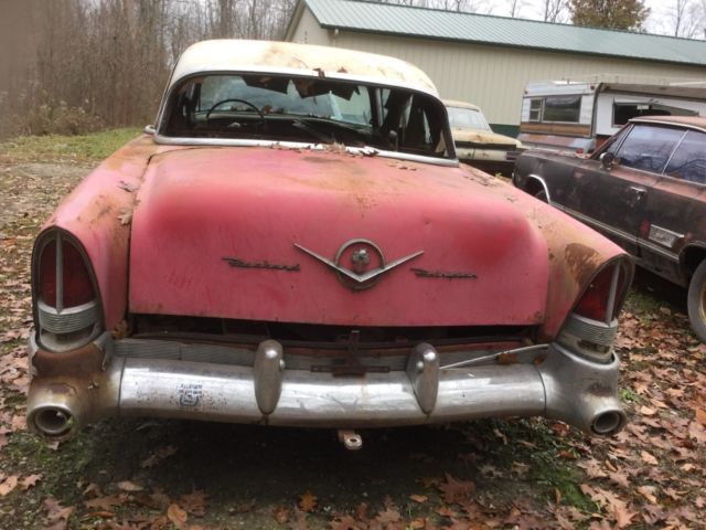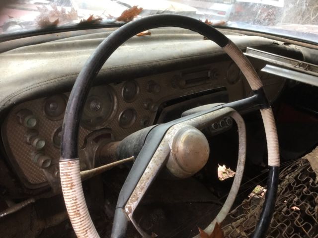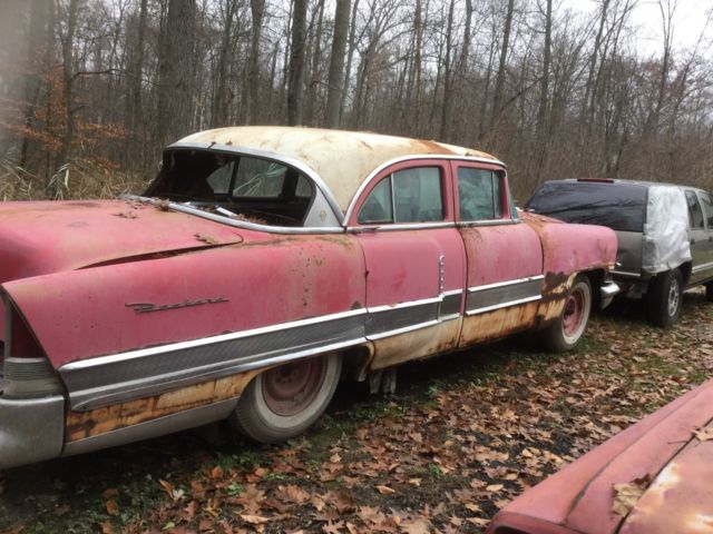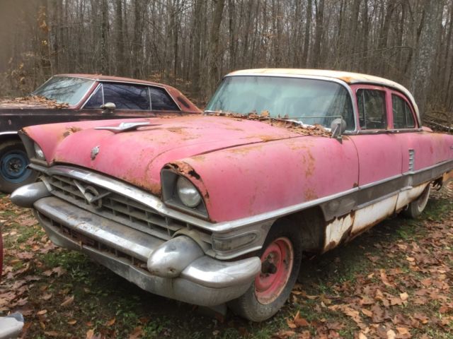 This is a 1956 Packard Patrician 4 door sedan. The engine is a 374/290 horse (does not turn). The car has not run since the late 1960's. The engine appears to be complete with the exception of a missing air cleaner. There is a twin ultra-matic transmission with push button activation. There is a power antenna, and tinted windows (all windows are bad), and power brakes. The interior has the following: radio, power steering, power windows, power seats, under seat heaters, and power locks. The color combination is Scottish Heather with a Dover White roof, the interior is black and white.This is one of 3,375 made, there is no tittle. This is a parts car only/ would not make a good restoration candidate, very rusty, and the interior has been well loved by raccoons.