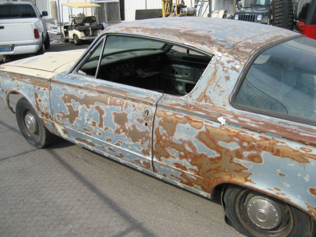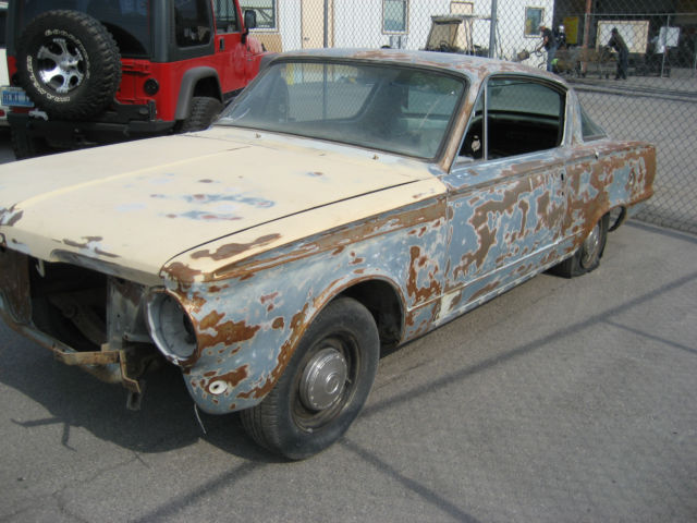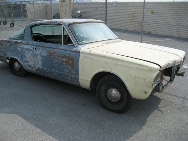 Ok so when you first look at it it doesn't seem like much BUT look closer!!! What we have is a 1964 Plymouth Barracuda V8 Automatic car, r it used to be. from what i can tell it was built in LA and lived there and in Las Vegas all its life, rob more in Vegas because this car is practically rust free as in the only rust i can find is on the front fender splash panels and the are bolt on. Now i'm not saying that if you send this out to media blast it will not come back with some hidden rust that i can see now buy i looked all over and under this car and didn't find any rust except the front fender splash panels there are some dents and holes from previous body repair but for being 51 years old not bad!! If you happen to have a rusted out Cuda that you are trying to restore this car will save you A LOT OF $$$$ and trouble!! I am trying to save this little gem from death in the Pic A Part yard which is were it is headed if it doesnt sell here and then to the crusher There are a lot of bits and pieces inside the car but I have not gone through them so look at the pics there is no motor or trans or any seats what you see in the pics is all that's there is!! If you have question please ask!!! This car is sold as is and the buyer is responsible for picking it up or arranging all shipping I will point it out to whoever is picking it up but that is all!!