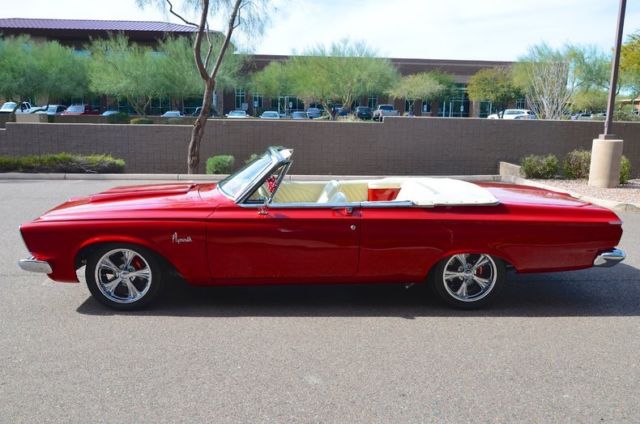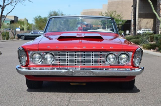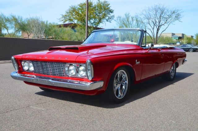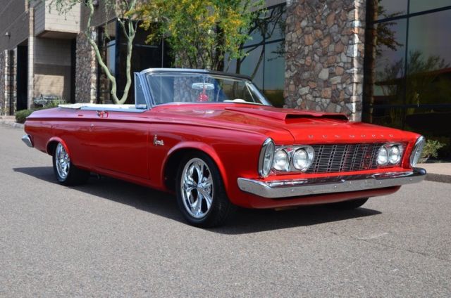 This 1963 Plymouth Fury Convertible Resto-Mod is painted a bright shade of red with a Max Wedge style hood scoop really stands out with it's white power convertible top and interior matching boot. Powering this Fury is a Mopar 528cid Hemi crate engine rated at 625 horsepower with 650 ft-lbs of torque. Power is transferred to the rear wheels via a Tremec 5-speed manual transmission with a 3.55 Sure Grip rear end and Moser axles. The Hemi breathes through a large 4-bbl Edelbrock carburetor while it exhales through a TTI 3" full exhaust system with ceramic-coated headers. A Be Cool aluminum radiator and an electric fan keep the big Hemi cool! The suspension was completely triangulated to handle the horsepower the engine puts out while Wilwood power disc brakes with drilled and slotted rotors squeezed by body colored calipers slow this Plymouth down. Boyd Coddington wheels shod with 235/45-17 front and 275/40-17 rear Michelin Pilot Sport Plus tires provide grip while the finished trunk houses the battery and power brake booster. The French stitched ivory colored leather interior features a matching leather wrapped billet steering wheel mounted on a Flaming River tilt steering column, uto Meter gauges, Hurst shifter and a Pioneer AM/FM/CD stereo system. Contact our sales department today to book an appointment to see this amazing car!