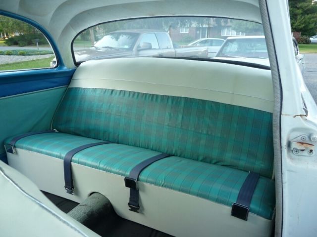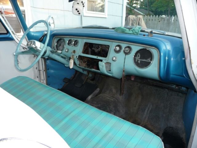 This is a very nice 1956 Plymouth. It is white with a white and blue interior. It appears to have been mostly garaged kept. There is virtually no rust under the car, rame or floors. There is a spot on the rear quarter where the paint is bubbling. There also is a small spot on the lower portion before the wheel. There does not appear to be any patch panels or metal work done to the car. No rust in the trunk. There was a chrome bumperette that was removed to streamline the appearance. Also a emblem and some lettering and hood ornament. They are included in the trunk. It has what appears to be the original flathead 6 cyl engine. It is standard shift on the column. The dash looks to be all original. Starts right up and runs well. The brakes do work. It has been sitting in a garage for a while so it should be gone thru before taking it on the road. search words, ow rider, treet car, ntique car, ace car, ead sled, lassic car, at rod, ustom car, /font> |