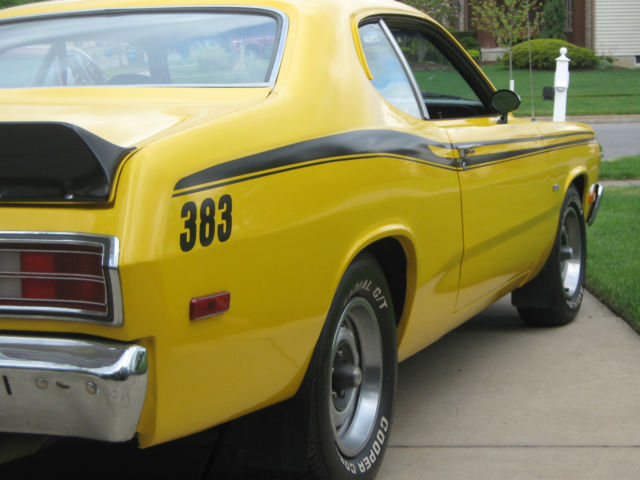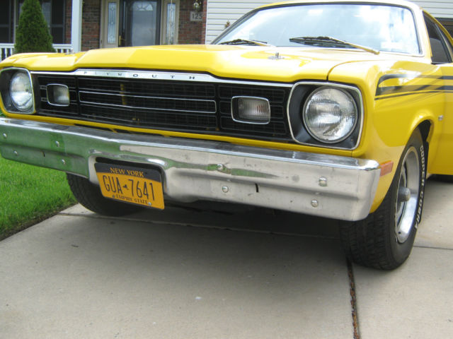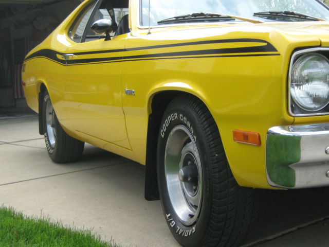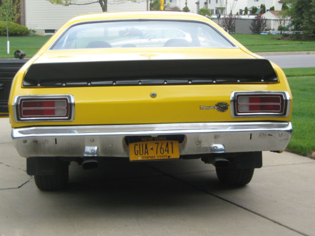| 1973 Duster ..68'roadrunner 383 and 833 4-speed..has 8 3/4 sure grip rear end ...power front disc brakes...new Hedman headers..... very good factory black buckets with fold down rear seat in great shape....new carpet ..door panel and rear quarter interior panels in good condition ...body/ frame rails /trunk solid ..15 inch rallies with like new tires....car in very good shape ..car drives fine ...good cruiser .....have youtube video ..............Mopar ........ muscle car .. a-body ....... classic ...... |