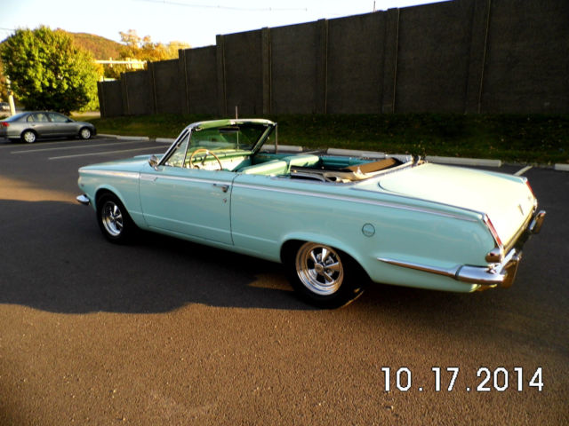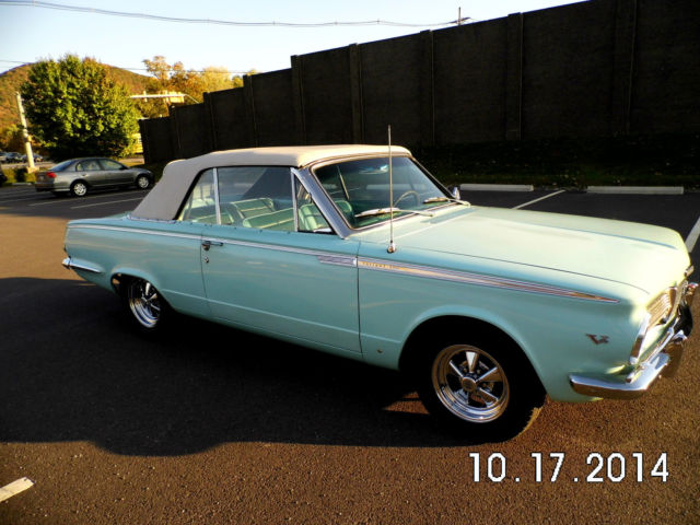 | FOR SALE A 1965 VALIANT CONVERTIBLE IMPORTED FROMCALIFORNIA CAR HAS ALL ORIGINAL SHEET METALWAS REPAINTED AND INTERIOR WAS REDONEINCLUDING THE DASH GAUGE PANEL WAS RECHROMEDALL CHROME IS IN EXCELLENT CONDITIONINTERIOR NO RIPS OR TEARSTHETOP IS NEW IT IS NOT POWERPAINT LOOKS TO BE AN OLD LACQUER JOB PAINT IS A LITTLE DULL IT LOOKS GOODBUT COULD USE A LITTLE MORE SHINEENGINE IS ORIGINAL 273 V-8 IS NOT A COMMANDO BUT HAS ALL THE PARTS TO LOOK LIKE ONETRANSMISSION IS A 4 SPEED OVERDRIVE FROM A VOLAREREAR END IS AN 8.25 WITH 355 AUBURN POSI HAS LARGE BOLT PATTERN FRONT DISC BRAKESSUSPENSION WAS REBUILTINSTALLED FRONT AND REAR SWAY BARS HAS NEW EXHAUST LIKE USED ON FORMULA S CARSGETS A LOT OF LOOKS ONLDEFINITLY NOT YOUR EVERY DAY RUN OF THE MILL CAR AT THE SHOW THANKS FOR LOOKING |