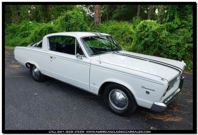 Sharp looking and very clean is this 1966 Plymouth Barracuda Fastback with S trim. It has a strong running 273 ci V8 engine and a smooth shifting automatic transmission. The body looks great and the paint is grayish white with sharp looking sharp stripes and very nice chrome and glass. Good solid original sheet metal. Great looking original floor sections, nd underside. No signs of rust and the brakes and suspension are in good shape. Car runs ad drives great. Plenty of power and a nice tight feel on the road. No noises, attles or squeaks. Nice sounding exhaust and gauges and lights all working well. The interior is very clean with new front upholstery and carpet. clean dash panel and pad. over all very nice car. Please call 941-928-2339 www.americanclassiccars.com
