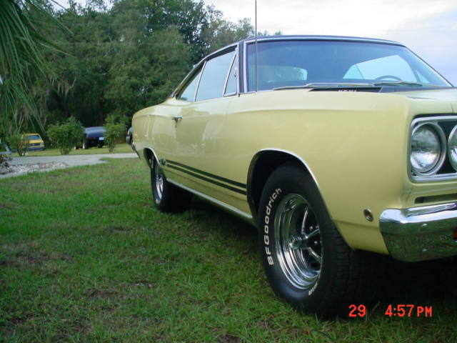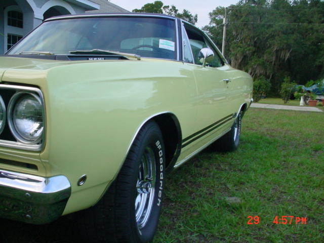 1968 Plymouth GTX Hemi RS23J Sunfire Yellow with Black interior and Bucket Seats. Complete Rotisserie restoration, ar is undercoated and perfect down to every detail inside and out. All chrome refinished, o expense spared, uns and drives great. The crowd has loved it at the Turkey Rod Run and Spring Spectacular Shows in Daytona. |