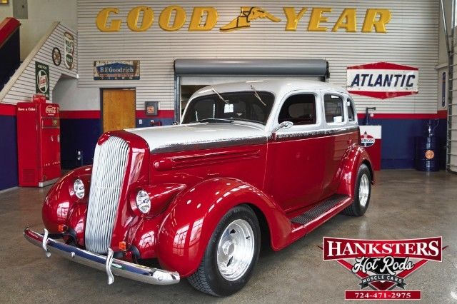 This is a wonderful example of the 1936 Plymouth P2 Deluxe four door Touring Sedan Hot Rod. With its dark candy red and silver paint and Eagle 15 alloy wheels, this 36 doesn't share much with its original counterparts. Under the hood is an impressive 350ci small block Chevy motor that is covered in chrome and performance parts. Edelbrock valve covers and air cleaner, Accel coil and super stock 8mm plug wires, cast intake and a Holley single barrel carburetor, to name only a few. The alternator, distributor cap, oil pan, and transmission pan, all gleam with chrome. Exhaust is handled by a set of ceramic coated shorty headers coming out the rear to dual chrome tail pipe tips. The 5.7L V8 motor is paired to a smooth shifting Turbo 350 Transmission and a 8 rear-end. Rolling on a nice set of BF Goodrich Excentia GT Radials, P215/65R in the front and P235/70R15s in the rear. The addition of front disc brakes makes nice improvement over the original 1936 breaking system. The radiator is stock and is aided by an electric fan. The shaved door handles, electric hide-away front license plated bracket, Full length running boards, and suicide doors, give this deluxe 4 door sedan and awesome look. The chrome front bumper and grill look fantastic and are accented by a set of custom turn signal lights. The full custom interior makes this sedan a total stand out. Automatic door and trunk poppers, power windows add a great touch. Power windows and a nice under dash AC unit with aluminum AC compressor make the interior comfortable. Custom cloth covered seats and matching door panels blend nicely with the Old style brush brass gauges and dark wood grain and billet plated dash. The Billet mirrors and billet tilting steering wheel, along with the awesome long arm floor shifter add some final touches that make this car shine. The sales brochure for the 1936 PJ series stated "this . . . Plymouth is the peak of perfection. Never before has there been offered a car so fine in detail, so positively right in all its engineering. It is distinctive in styling. New beauty is apparent in every angle -- new radiator grille, ornament, headlamps and hood louvers -- new heavier fenders and more massive body -- all expressing greater value!" The 1935-36 models were a solid success that deserve credit for advancing the state of the art in "common man" cars. With the added touches to this car, it is far from being a car for the common man. 350ci Small Block Chevrolet V8 Aftermarket lights for turn signals Air Conditioning Aluminum AC compressor Automatic door poppers Automatic trunk popper BF Goodrich Excentia GT radials Billet mirrors Billet steering wheel Black paint graphic on the 2 color line Cast intake w/ Holley single barrel carb Chrome distributor cap Chrome front bumpers Chrome oil pan Chrome transmission pan Cloth wrapped door panels Crank rear windows Custom cloth seats Dark Candy Red w/ Silver top paint Dark wood grain dash w/ billet plates Dual tail pipes tips Eagle 15" alloy wheels Edelbrock chrome valve covers Electric hide-away licence plate bracket Front Disc/Rear Drum Brakes Front: P215/65R15 Full custom interior Full length running boards Long arm floor auto shifter w/ hand E-brake Old style brushed brass gauges Rear step in trailer hitch for back bumper Rear: P235/70R15 Shaved door handles Shorty ceramic coated headers Stock radiator with electric fan Suicide rear doors Tinted Glass Turbo 350 Automatic Transmission Under dash AC unit and vents |