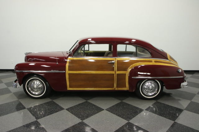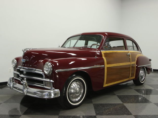 Honestly, where else are you going to find a cool cruising coupe with fresh wood on the sides for less money? This 1950 Plymouth Club Coupe is an affordable and fun way to enjoy classic car motoring. It turns a ton of heads and can even impress a judge or two with its original power plant under the hood.We already know you want this because there's just something extra cool about a woodie coupe. That's especially true when the custom fresh lumber is applied to the cool slope back design (we know it's not factory, but it still looks awesome). But even beyond the timber, the burgundy paint has such a nice luster that shines evenly with the lacquer in the wood. The big bold front end is intact right down to the Mayflower hood ornament. Plus, the chrome bumpers are so big they look like they could push a train. This classic Plymouth is not trying to be a hot rod, and so there is a refreshingly honest impression that you see in everything from the factory hubcaps to the big round roofline. Even all that flowing stainless trim on this DeLuxe model has not been altered.The tasteful interior is pure post-war comfort, like the warm glow of a Victrola and the smell of mom's cooking in the kitchen. The beige cloth upholstery has that same feeling, and there's plenty of room for six inside this coupe. It wears its age with pride by showing off how durable Plymouth made their products 65+ years ago. That's why you get the original three-spoke steering wheel with three-on-the-tree easy shifting. All the instruments are fully functional, as well as the AM radio. The under dash heater is even there for those extra early morning drives to the car shows.With a coupe that's looked this classically authentic so far, it's a delight to find the original 218 cubic-inch six-cylinder under the hood. The engine bay is tidy and quite authentic, showing original parts including the oil bath air cleaner. The motor fires up easily just as a trusty Plymouth should, and it has that wonderful mechanical sound that's sadly absent from our cars today. Good gearing and plenty of torque makes it peppy around town, and Plymouth cars really did ride much better than many of its rivals. The total package has the kind of reliability and comfort that gives this coupe usefulness beyond just a Sunday driver. This Plymouth is the affordable woodie that will get you plenty of admires every time you hit the road. And with such an honest and dependable setup, you only need a whim to enjoy this history on wheels. Call today!!!