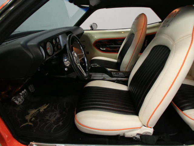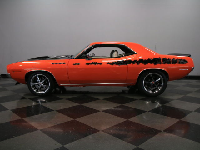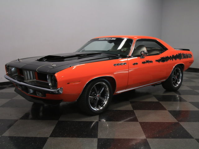 This 1974 Plymouth 'Cuda was built with the art of the car in mind. It's a labor of love that includes beautiful custom paint, one-of-a-kind A/C interior, five-speed manual, and a mean 512 ci 600 hp six-pack monster under the hood this coupe is what happens when someone decides that only the best will do.Tangelo Pearl, that's the name of the amazing color that immediately grabs your attention. While that expensive shade, and extra deep clearcoat are worth every penny (even on the undercarriage!), that's not everything that keeps you focused on this coupe. It perfectly blends old and new world styles with the classic blacked-out hood treatment and the airbrushed graphics running down the side. Yes, that's a barracuda skeleton showing off the evilly aggressive soul. Even the wheels are a perfect blend, with the Mopar Performance alloys hinting at classic design lines. This 'Cuda was Gold-Certified at the Chrysler Nationals, and is a five-time first-place winner. That means all the details are really right on this one. The panels have a precision gap that comes from time and effort (this car has no shims!) There's investment in items like the HID headlights surrounded by hydro-dipped bezels (look very closely for the 'Cuda skeletons here too), door handles integrated into the custom graphics, Rhino Liner in the rear wheel wells, and custom LED brake lights built into the spoiler. We could list all of the investments in the exterior, but then we'd run out of room to go over all the work on the interior and drivetrain.No expense was spared getting the inside to be the coolest custom setup any Mopar fan would love. It carries all the iconic classic elements like the 'Cuda on the broad door panels, expansive dashboard, and pistol-grip shifter, but there's so much more. The exterior orange is used as piping for the custom leather seats, a door panel boarder, and the basecoat for the custom flames running throughout the interior. That attention to uniform detail is a true award-winning touch only seen on the best cars. You'll slip behind the custom 'Cuda chrome wheel and see all the information you need, including the large AutoMeter Phantom speedo and tach. This coupe is loaded with power windows, custom cup holders, and ice-cold air conditioning. The AM/FM/CD stereo has a hookup for your iPod to play out of the 1,400-watt subwoofer system, but really your favorite soundtrack will always come from the engine bay.Under the hood is a true beast. This build is custom to the core with the 440 cubic-inch V8 enlarged to 512, and yes, it has the famous triple deuce "six-pack" carburetors. It also includes Bullet roller cam & lifters, ported & polished performance heads, forged crank, and JE pistons. There are a TON more performance components to list (call for all the details) but just know that this is rated at 598 rear wheel horsepower, and the header-fed dual exhaust (with cutouts) lets the world know it! The stout Tremec TKO 600 five-speed manual transmission means you have complete control over this power package. And it all reliably hooks up with the ground via Moser Dana 60 rear end, fortified with Alloy axles and a Detroit locker. But more than just all out performance, this is an overdrive transmission car with power steering and Wilwood four-wheel disc brakes. So the motor has been fortified with reliable components like an aluminum radiator and dual speed electric fan. This all means you can reliably cruise this beast all day with the A/C cranked (that's why much of its 12K miles since built was added on the Power Tour!)This was already a rare Mopar before the custom work began, and you'll be shown the factory build sheet, owner's manual, maintenance records, and restoration photos & receipts to prove it all! We've already run out of room to tell you about the ~$200k spent on all the exterior, interior, and drivetrain components that went into this labor of love. So call today for all the details on this one-of-a-kind Mopar that's turnkey ready for roadtrips and award shows! |