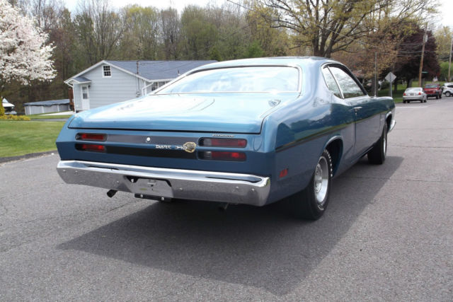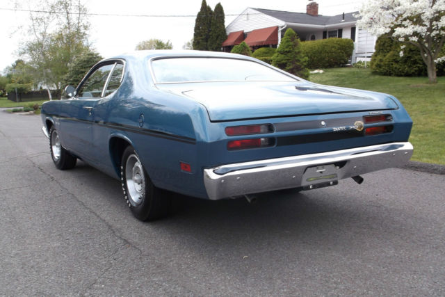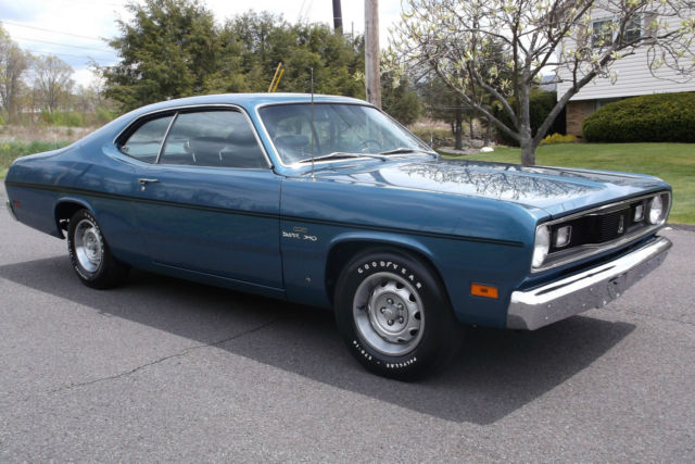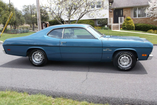 1970 Plymouth Duster 340 Once in a lifetime find Original matching numbers 340 engine (bore 0.30, blue printed and balanced) Original A833 4 speed transmission Original 8 3/4 3.91 ratio positive traction rearend Original carburetor (rebuilt) Original alternator (rebuilt) Rare drivers side factory black exhaust heat shield Upgraded Accel distributor (have the original) Factory front disc brakes 150 MPH Speedometer Documented, original 30,049 miles Complete history of ownership from day one Original 1970 License Plates Original Warranty Pamphletwith Original owners name Receipt dated 8-6-1970 for 500 miles break-in oil change Original fender tag Original build sheet in plastic sleeve in perfect condition Original owners manual Original correctly restored bumper jack Matching Goodyear Poly Gras spare tire in the trunkwith correct trunk mat Original interior except for new headliner and carpet Rally dash with center tachometer Original, excellent condition wooden shift knob on the Hurst shifter All original sheetmetal with no rust ever, anywhere, no fillers and laser straight Extremely rare mirror finish B7 Jamacian Blue Paint with correct black stripes All glass in the Duster is original dated coded Rally wheels and Goodyear Poly-Glas tires Factory ordered dual exhaust without the usual chrome box tips Duster was restored over a 4 year periodand put in climate controlled storage Personal or third party inspections are very much welcome and encouraged, absolutely must see this car in person Car is sold as is where is with no warranties intended or implied Mopar Collectors know thatfinding a factory 1970 Duster 340 in this condition with history, documentation, originality, rare color and very low original miles is extremely rare Serious parties can call 570-383-7506 |