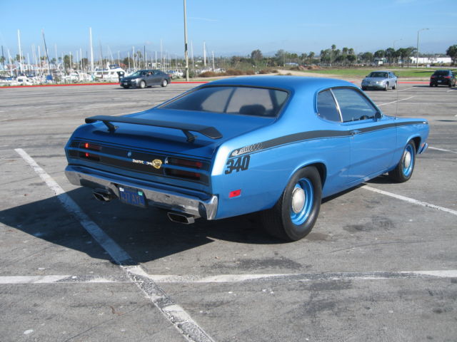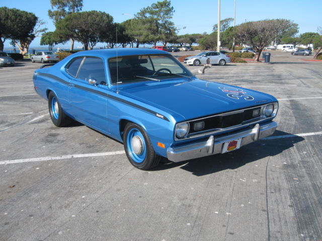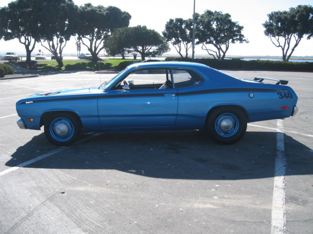 I'm selling my son's 1970 Duster 340 tribute car. He would rather have the money for college then the car. The engine is a rebuilt 340 with a cam, aluminum intake, ceramic coated headers, Aero heads (cast iron), and Edlebrock 750 carb. The transmission is a rebuilt 904 with a shift kit and a 2500 rpm stall converter. The 8 3/4 rear end was rebuilt with a sure grip, 3.55 gears and new axles with the large bolt pattern. The front end was rebuilt and large bolt pattern front disc brakes were installed. The paint is B5 blue, less then 8 months old, all the graphics are from Phoenix Graphics and were professionally installed. The interior seats were re-upolhstered and a new dash pad and carpeting were installed. This car sounds awesome and attracts all kinds of attention when ever we cruise it. For any further questions, please call me at (619)990-9849 and ask for John. The reserve is low for a car of this value. Thanks and happy bidding!
