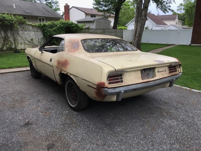 1970 Plymouth Barracuda: off the road last 27 years, has non-matching 1970 383 motor, automatic trans, 8 3/4 rear, new parts are: rear quarter panels, head liner, rug, seat covers, trunk pan and gas tank. Too many used parts to list. Solid floor and frame. I have extra fire wall. Need of a FULL RESTO. It was a factory 318 car. This is a NO reserve auction. Will sell to the highest bidder. If youwould like a higher offer, please contact me.I have clear title in hand. Located in Deer Park, NY (11729). Call Lou for any questions or other info : 516-721-3951.
