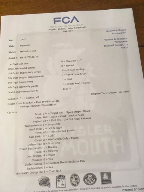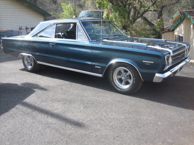 1967 Hemi GTX. 426 Hemi, auto, 391 posi. NOT NUMBER MATCHING. Car was originally red with black interior and black vinyl top. Now has 1967 ee code paint, dark blue with black interior, no vinyl top. I bought this car in 2005 and was restored in 2013. Engine is a 484 stroker, new mopar block NOT siamese bore. JE pistons, eagle rods, comp hydraulic roller cam, roller lifters, and roller rockers. Mopar performance alumimum heads, factory intake and exhaust. Accurate exhaust system from Oregon. 1967 Hemi Trans 2800 stall converter, no fender tag or broadcast sheet. I have a copy of the build sheet from Chrysler Historical FCA - see pic. Has 15x7 torque thrust American wheels and Cooper tires. PDB - PS - Tach - Clock - Headrest. Runs good, very streetable, clear CA title in my name, Edelbrock carbs were built my Mike in Spokane WA. Car has 1500 miles on it since restorations. No rust. Quarter panels were replaced with original rust free quarters off of a 1967 Belvedere due to previous owner radiusing for big tires, not because of rust. Car is sold as is where is.