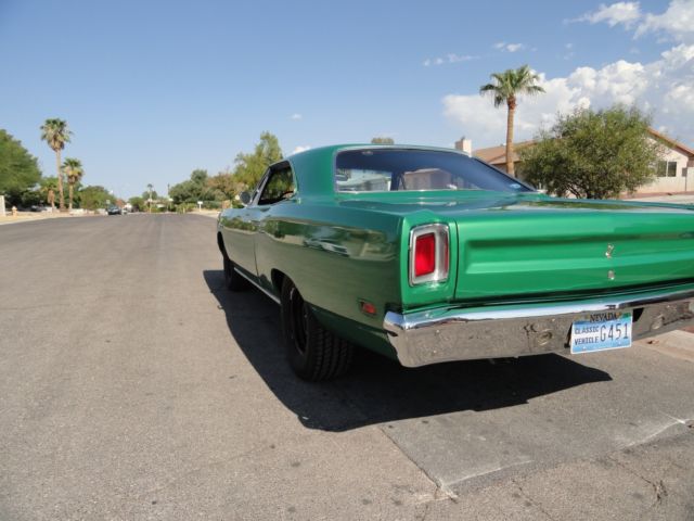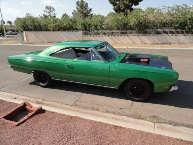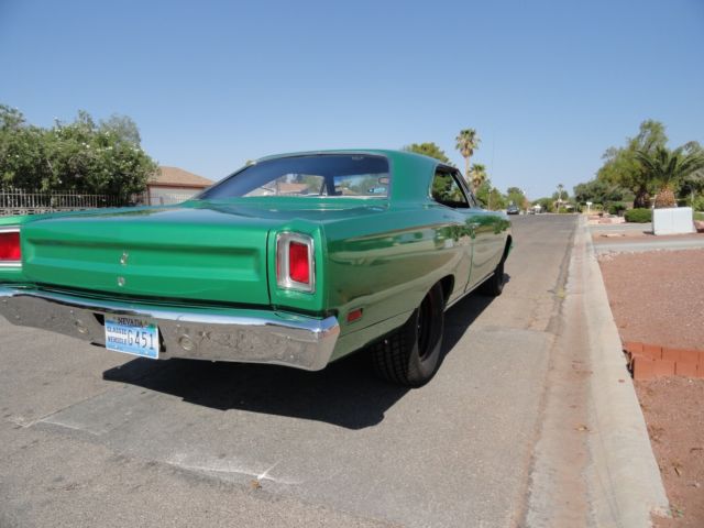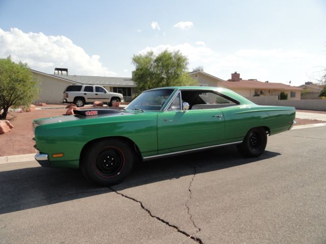 1969 Plymouth Roadrunner original 383, now has 1970 440 six barrel with hemi 4 speed 18 spline transmission. The codes on the motor F 440 HP2 build date on block is 10-29-69, left exhaust manifold 2951865, right exhaust manifold 2899879 and intake 2946275. Story goes from previous owner engine and transmission were pulled from a wrecked car in 1981 before it was junked. While the car was painted back to its original color Rallye green the motor was resealed and freshly painted. A new clutch and pressure plate were also installed at that time. All new hoses, spark plugs and wires were also done. The power steering gear box was sent out to be rebuilt. The car was very solid and did not require much bodywork to finish. Thebody still retains all its original sheet metal. After the car was painted the underside was cleaned and undercoated. Then all new brake lines, e-brake cables, fuel lines, shocks and exhaust were installed. New tires were mounted on factory 15" steel wheels.The interior is in nice shape with the seatupholstery and carpet replaced recently. All the factory gauges work in the dash including the factory tach. Both front and rear bumpers are new AMD. All the glass is nice and all windows work as they should. The headlights, high beams, tail lights, brake lights, turn signals and horn work as well. Therear end is a factory 8 3/4 sure grip with 3:23 gears. This is a nice car, it is not perfect but it is a car you can take out and enjoy. Please serious bidders only, I will not end the auction early. I am selling at NO RESERVE so high bidder wins. All questions will be answered and if you would like to call I am Scott 702-339-0572. I do not have a build sheet or a fender tag, this is an original Roadrunner. The engine and transmission are not original to the car. |