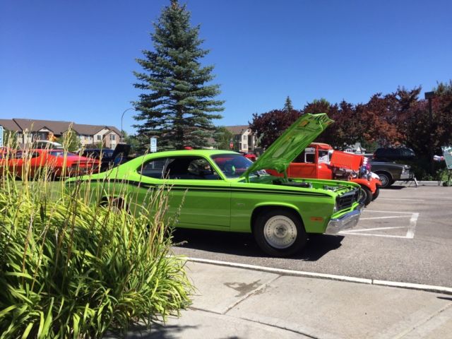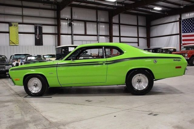 1973 Limelight Green Flashy Duster. Paint job is beautiful. Interior, no rips or tears. Lots of new. Car started life as a red manual 6 cyl. Prior owners did the engine, Autometer gauges, paint and interior. Within the last two years I have added 8 3/4 posi rear, new Holley carb, new disk brakes all around, new mufflers, new ball joints and control arms, lots of small stuff (have receipts for all I've done. Rear tail light section was done like a 1970 with no chrome surrounds. Tires less than 300 mi on. Rear tires wider for a nice stance. Recent show winner. As for the negatives: Has a nice headliner that needs to be secured up a little better. I just have not gotten to it. The back window chrome needs a clip or 2 at the top. Some minor bubble on bottom of rear quarters. Gas gauge can be a little dodgy. This is a head turning car. I love the car, just selling it to get my money out for other purposes.
