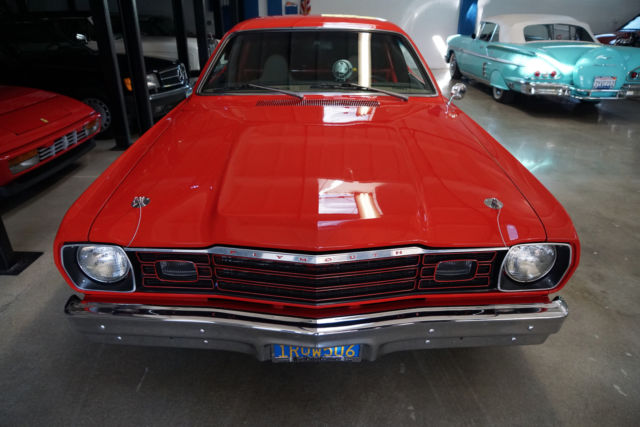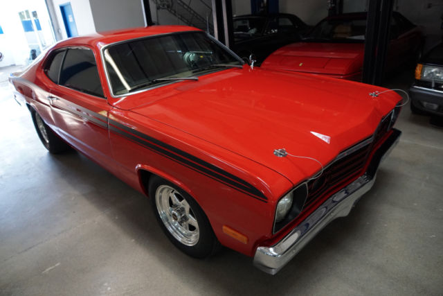 West Coast Classics are proud to present an absolutely exceptional and beautiful example of this wonderfully, and with no expense spared whatsoever, customized race ready 1973 Plymouth Valiant Duster which received a full frame off restoration and customization by its previous owner with a Mopar Magnum 5.9L 360/390HP V8 performance crate motor and is finished in a striking custom 'Red' color with factory period Black '360' racing stripes and graphics and a custom grey velour bucket seat interio...r with black carpeting. Ready to show or race.The car was originally born as a 1973 Plymouth Valiant Duster Coupe and the car has been recently and professionally customized at a renown restoration/racing shop of Costa Mesa, CA with no expense spared by its previous owner. The car and motor has perhaps 439 miles on it since the build with the following specs as we know them:360 Magnum Crate Roller Motor with bench flowed headsHolly 750 carbCustom Cooling SystemRemote Oil FilterStainless Headers3 Speed Torqueflight trans with a 3200 stall & coolerCustom Flowmaster exhaust with push button exhaust dumps at the headers so it can be taken straight from the street to the riggers of the track.Body has been custom shaved to remove gas fill, mirrors and antenna holes.Custom Red paint and factory period correct stripes on sides & rear.Tinted WindowsFrame has been extended to the sides to prevent body roll.Custom hidden traction bar on rear end.Thrunk contains a fuel cell with dual batteries & 2 x 12" subwoofers.Fully caged interior.Tubbed to tuck big rear tires under the fender wells.Fender wells extended and molded into body.Interior dash modified aith hidden dash opener.Custom steering wheelAll new qauges.Custom real leather door panels & kick panels.B&M speed shifter on the floorSimpson 5 point harness'Custom stereo hidden in glovebox drives custom fitted cabinets behind front seats with 2 amps, 8 speakers and a capacitor. 2500 total watts. This particular car is now a seriously striking racing Duster which turns heads wherever she goes! With everything virtually brand new, it is the perfect turn key ready racing Duster to buy today for any custom muscle car or Mopar enthusiast who wants to do nothing but to race or drive fast and enjoy it NOW! This must be one of the most heavily invested in and completely rust free and tastefully fully restored examples of a professionally customized 1970's Mopar available anywhere; primarily with speed in mind in turn-key ready daily driving, daily head-turning, and daily appreciating condition!