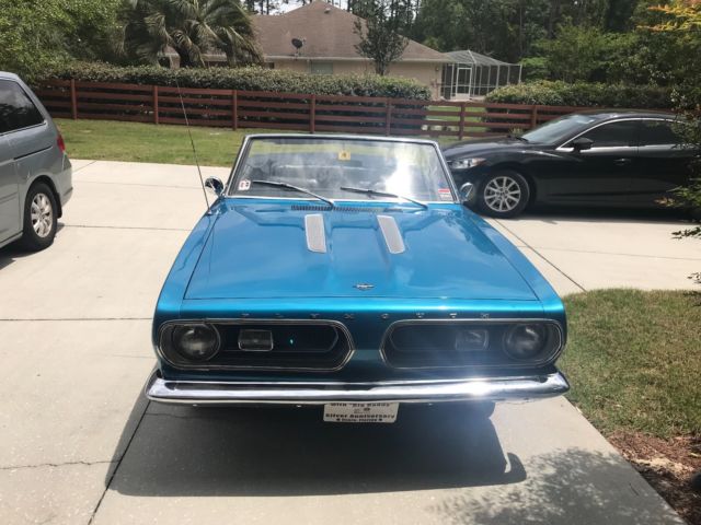 For sale 1967 Plymouth Barracuda Convertible 1st year of the Barracuda Convertible. Engine rebuilt professionally about 3 years ago. 318 block about with 340 cam, dual-plane high rise intake, 650 performer carb, 8 ¾ rear 3:23 gear. Also done about 3 years ago, flowmaster 40s with x pipe Legendary seats, carpet and door panels. New dash bezel, top with glass window, 22" radiator. Kick panel speakers with hidden amp in glove box with Bluetooth connectivity. Power subwoofer under the seat to round out the sound. Original radio still installed. I purchased this car about 3 years ago. The previous owner had all the work done on the car except the speakers and amp. I have had the car maintained by a local professional mechanic. Recently replaced the battery. Last time I had it at the shop we found a bolt had come loose in the front sway bar. Decided to replace linkage and bushings as well. Still waiting for parts to come in. Also just recently discovered the top will not go up and I think it's the switch. Up until that point the top operated flawlessly. Hoping to get it looked at. There are two pics on the passenger side that show a few scratches in paint but nothing major. I really enjoy the car but just don't have the time to enjoy it like I would like. Only driven when it's not raining. Serious offers only please. Title in hand. NoPayPal. Car is for salelocally as well. I reserve the right to end this at anytime. Videowalk around and engine running-https://www.youtube.com/watch?v=zyR6wXQBUAk