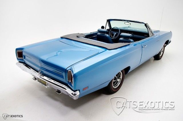 | 1969 Plymouth Roadrunner Convertible 1969 Plymouth Roadrunner convertible finished in B5 Blue Fire with white top over Blue interior. Having gone through a complete restoration. this classic muscle car comes to us in stunning condition inside and out! Only 2. 28 Convertibles were made for 1969 making this bird exceptionally rare. Featuring a NUMBERS MATCHING drive-train including the 383/335 horsepower V8 & 727 heavy duty automatic transmission. white power convertible top. Mag 500 wheels with red-line tires. 2 convertible tonneau covers in black AND body color. an ORIGINAL never-been-used red-line spare spare tire with OEM sticker intact. and blue seat belts. Other options decoded via fender tag include; (M21) Belt Moldings. (N85) Tachometer. (R11) AM Radio. (A01) Light Package. (B51) Power Brakes. (C16) Woodgrain Console. (C55) Bucket Seats. (G33) Driver's Side mirror. (L31) Hood Mounted Turn Signals. (B5) Blue Fire Paint. (M6B) Blue Interior Trim. (B7) Blue Interior. (E63) 383/335hp V8. (D32) Heavy Duty 727 transmission. (RM27) Convertible. and (H9G) Hi Power 383. This Mopar has been well cared for its entire life with a complete tune up recently completed. Other recent services include; front disc brake overhaul. new wheel bearings. new mufflers. overhauled carburetor. new fuel pump/filter. original radiator re-cored. new spark plug wires. new front shocks. sway bar bushings and new battery. This bird is a prime example of American muscle and will continue to appreciate and reward its next owner! This car has gone through our Cats Exotics 75 point used vehicle inspection and is available upon request. Please Note: If you are viewing this vehicle on a site other than CatsExotics. com. please head to our website for more photos and video of this vehicle! Cats Exotics offers a wide variety of Lease and Purchase options! Call for more details! *If payment example is displayed then payment is calculated to reflect a 20% cash/trade equity down payment for a maximum term of 144 months with an APR of 4. 99%. Rates and terms are subject to change and loans are subject to individual credit approval. Not all applicants will qualify. All taxes and state fees will be an additional cost. OAC means On Approved Credit. The payment provided by this calculation is for illustrative purposes only and should not be considered an offer to extend credit or an offer of sale. Credit application and approval required. Actual payment and interest rate may vary with each individual situation. Be sure to consult a financial professional prior to relying on the information outlined above. These calculations are intended for illustrative purposes only and accuracy is not guaranteed. This Vehicle is Being Sold "As-Is. " Unless otherwise stated in the vehicle description. this vehicle is being sold "as is". No representations or warranties are made by seller. nor are any representations or warranties relied upon by bidders in making bids. Manufacturer's warranties may still apply. Please also note unless otherwise stated assume all vehicles come with only one key and no manuals. Please ask your sales representative to verify for extra keys or manuals. Out of state buyers are responsible for all state. county. city taxes and fees. as well as title/registration fees in the state that the vehicle will be registered. . Vehicle listings and information are subject to change without notice. Vehicles are also subject to prior sale without notice. While every reasonable effort is made to ensure the accuracy of this information. we are not responsible for any errors or omissions contained on these pages. Please verify any information in question with Cats Exotics. |