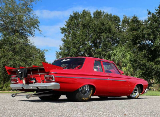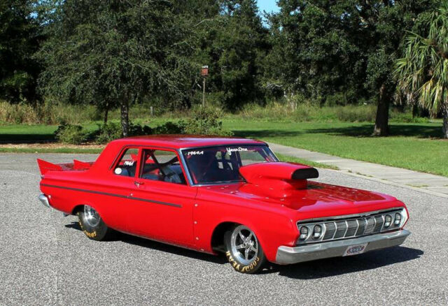 1964 Plymouth Belvedere Drag Car For Sale. Classic style and state-of-the-art drag-racing technology intersect in this 1964 Plymouth Belvedere Drag Car. Constructed in 2002 with race-proven equipment and fabrication, this mountain-motored monster looks intimidating as it flies down the quarter mile in classic Belvedere B-body style. The Belvedere's 572 CI worth of Keith Black V-8 block and cylinder heads make for quick and fast runs down the strip. The RB-series wedge is equipped with a pair of Barry Grant Dominator 4-barrel competition carburetors fed by a BG400 fuel system and pressure regulator. An MSD 7AL-3 delay-box ignition lights the fire and multiport nitrous oxide waits to add more power. Dry-sump oiling incorporates a Hamburger's aluminum oil pan, System One oil filter and belt-driven camshaft. Power gets down to the ground through a Reid Powerglide automatic transmission and Strange axle kept in line by a 4-link rear suspension with a panhard rod and wheelie bars. The Plymouth is painted blazing red from the fiberglass front hood and fenders to the trunk and rear stabilizer. The factory grille, door handles and trim spears hold onto original Plymouth good looks, and steel bumpers were reproduced in lightweight fiberglass. Quarter-turn Dzus fittings make for quick removal of the scooped hood and entire front bodywork. Red-painted roll bars surround a single black bucket seat with a Stroud SFI racing harness in the cockpit. The Belvedere waits for its next pilot to grab the Grant GT steering wheel, hook up the Weld Racing Prostar drag wheels and Goodyear Eagle slicks out of the box and pull the chute out on the top end.