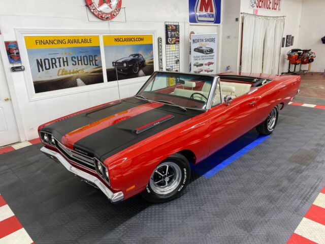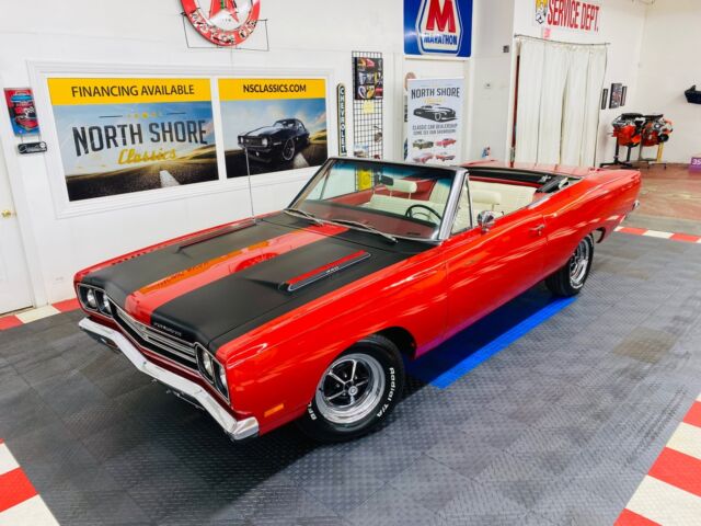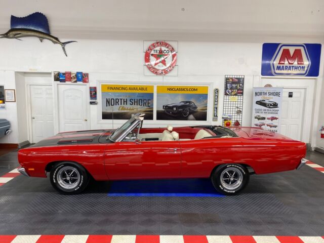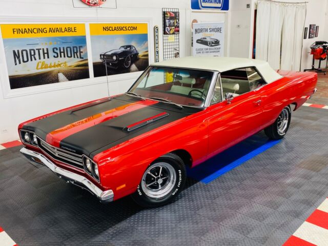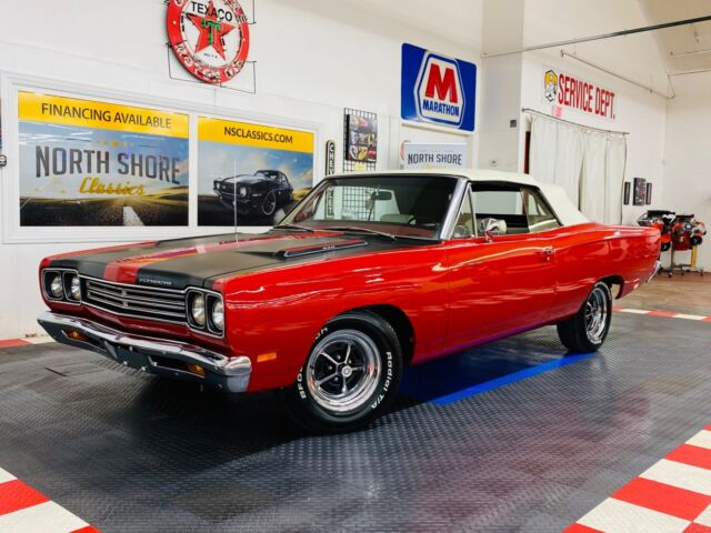 1969 PLYMOUTH ROAD RUNNER *RARE CONVERTIBLE *440 ENGINE * EDELBROCK ALUMINUM INTAKE *HEADERS AND DUAL EXHAUST *MALLORY UNI-LITE DISTRIBUTOR *MALLORY PERFORMANCE PLUG WIRES *NEW ENGINE BAY AND FORWARD BODY WIRING KIT *AUTOMATIC TRANS *BRIGHT RED PAINT *CLEAN BODY AND FLOORS *POWER STEERING *MANUAL BRAKES *POWER TOP *CLEAN WHITE INTERIOR *NEW BLACK CARPET *CHROME MAGNUM 500 WHEELS *BF GOODRICH RADIAL T/A *POSI REAR END BEEP BEEP..... HERE IS THE ROAD RUNNER CONVERTIBLE THAT YOU HAVE BEEN LOOKING FOR!! WITH EVEN MORE PAVEMENT POUNDING HORSEPOWER THAN IT WAS ORIGINALLY GIVEN, THIS 440 POWERED BEAST WILL TATTOO THE ROADS WITH EASE. THE WELL DETAILED ENGINE BAY SHOWS OFF THE QUALITY OF THIS RESTORATION. THE BODY IS STRAIGHT, THE GAPS ARE NICE AND EVEN, AND THE BRIGHT RED PAINT SHOWS VERY WELL!! JUST TURN THE KEY AND THIS STREET MACHINE IS READY TO ROLL. THIS PLYMOUTH RUNS AND DRIVES GREAT, IT STOPS AND STEERS REALLY WELL TOO. ASK US ABOUT OUR EASY FINANCING WE TRANSPORT WORLD WIDE |