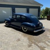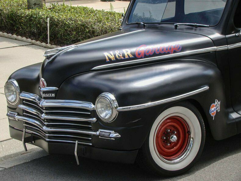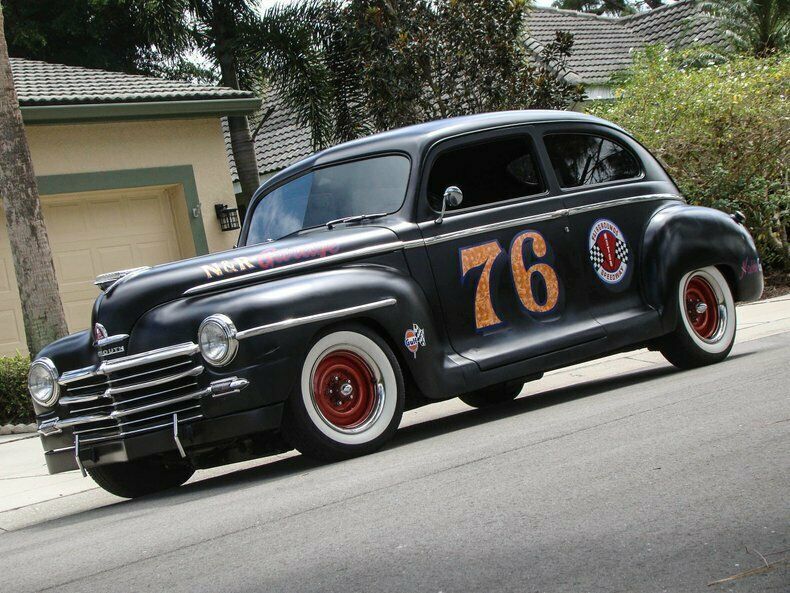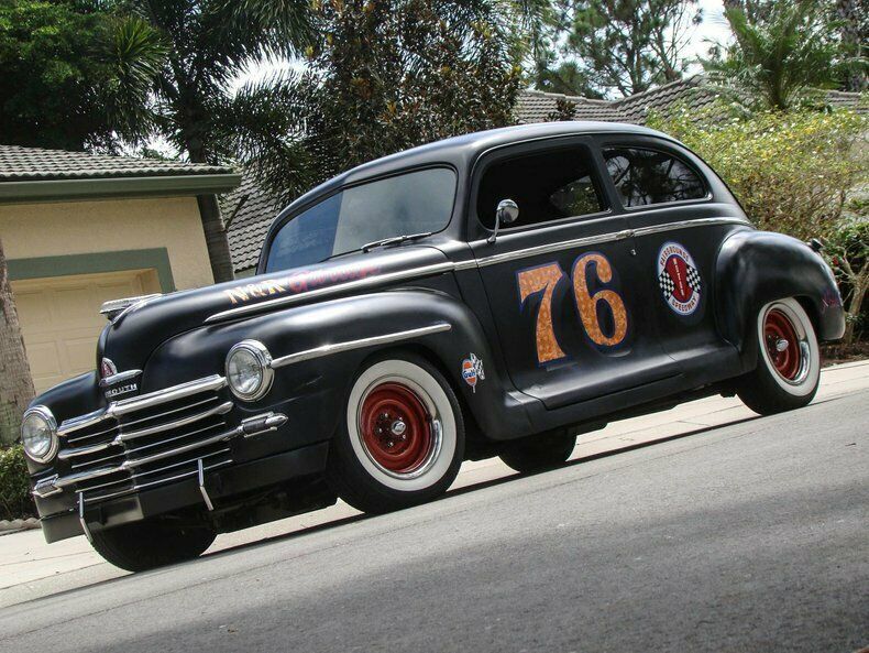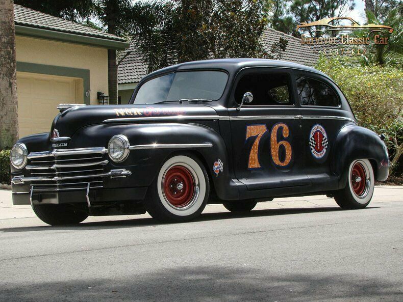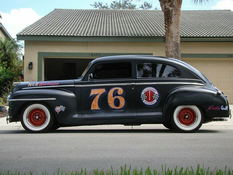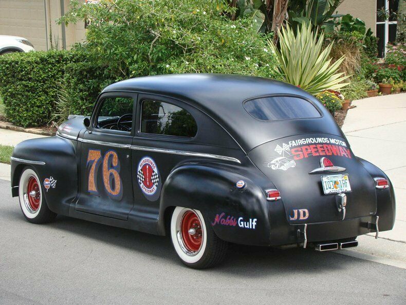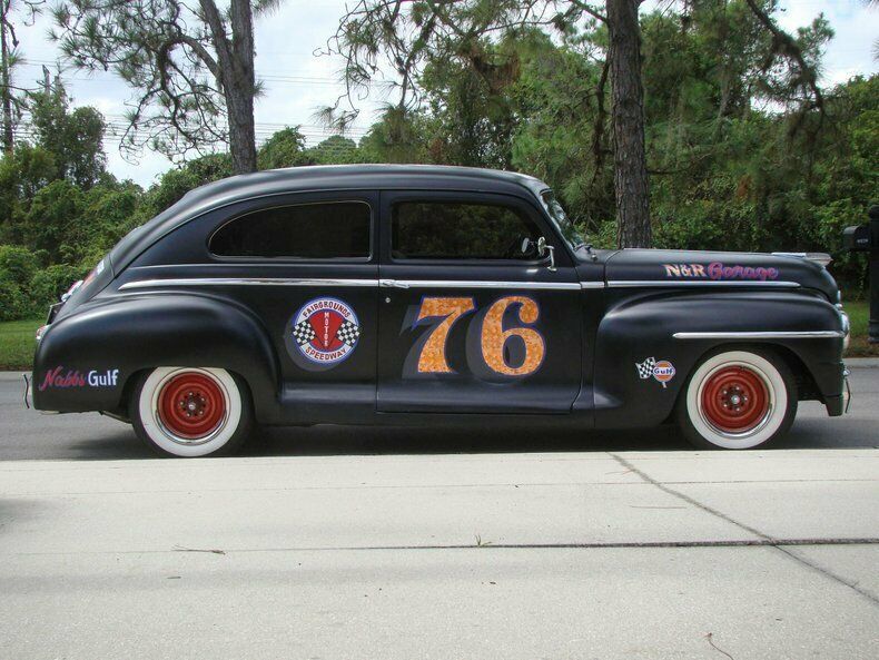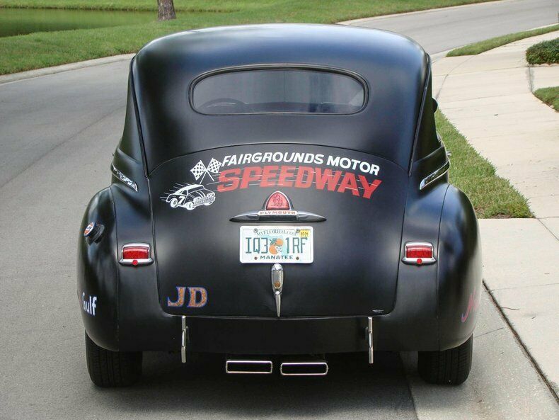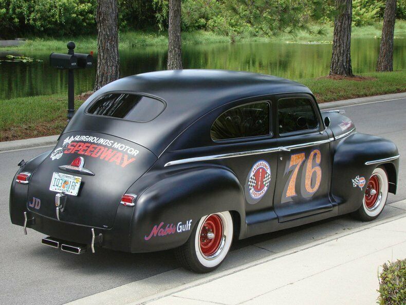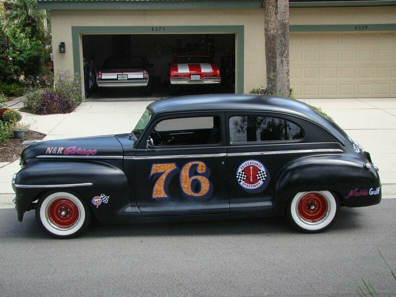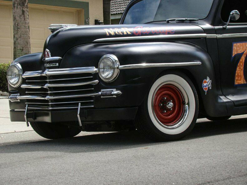 Please visit for additional photos, information and a video. Check out this cool 1948 Plymouth Custom 2-door sedan. Painted in Hot Rod matte black paint with graphics for the Fairgrounds Motor Speedway in Louisville Kentucky! Golf leaf has been used for the accents on the graphics to really make it pop in the sun. Red steel wheels with beauty rings are wrapped in wide white wall tires. The restoration is about 10 years old and still shows very well. This is a great cruiser with a Chevy 350 V8 under the hood with a 4-barrel carburetor with electric choke, and finned aluminum valve covers and air cleaner. The inside of the fins have been painted red to really make them stand out when you raise the hood. The alternator is chrome and pairs nicely with the aluminum radiator, billet overflow, polished A/C compressor, billet pullies, chrome master cylinder cap, and red distributor cap. That V8 runs to a Turbo 350 automatic transmission that shifts on the column. Power steering, power brakes, a Mustang II front end and A/C make this a great car to cruise in and the tinted glass keeps it enjoyable during summer months. The interior has also been restored and looks great! Black leather-like vinyl on the seats is comfortable and gives this Plymouth a very clean look. The whole car was rewired during the restoration and an AM/FM/CD player was installed. The window "cranks" are actually switches for power windows! How cool is that? An electric fuel pump and electric fan make this car easy to start and keep it cool, even on long hauls. This vehicle was built by the sons of a dirt track racer in his memory and is a cool piece of automotive Americana! It comes with a car cover and an assembled 1948 Plymouth grill. This vehicle is eligible for an Extended Service Contract through Classic Vehicle Protection. Please visit warranty for more information. For additional information on this and our other classic and collectible cars for sale, please visit For assistance please call the office at 855-472-2982, text our cell phones at 855-472-2982, or email us at . We are located between Tampa and Sarasota. We are 90 minutes from Orlando and Fort Myers.