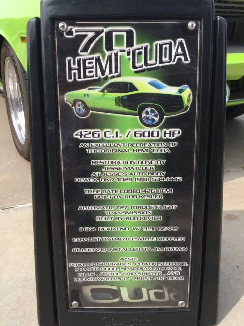 Vehicle Details 1970 Hemi Cuda Recreation. 1971 Style "Gills", 1971 Style Bill board graphics, 3.91 ratio 8 3/4 differential, 68 Date Code 426 Hemi 425 HP, 727 torqueflight automatic, Center console with “slapstick”, Fog lamps, Spoiler. Some issues antenna broken, passenger rear wheel well scrapes on tire, Valve covers oil leak, Passenger side window needs work, Radio doesn’t work. I've posted pic's for most of this. for more information email at phonedude4646@gmail.com. I have many more pictures. This is a “Used Vehicle” and therefore will be sold “AS-IS”. Inspections are welcome PRIOR to the auction ending.