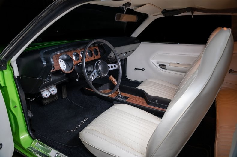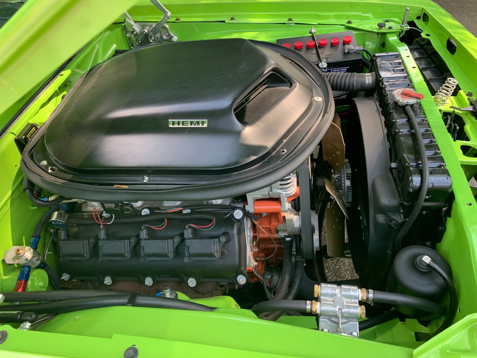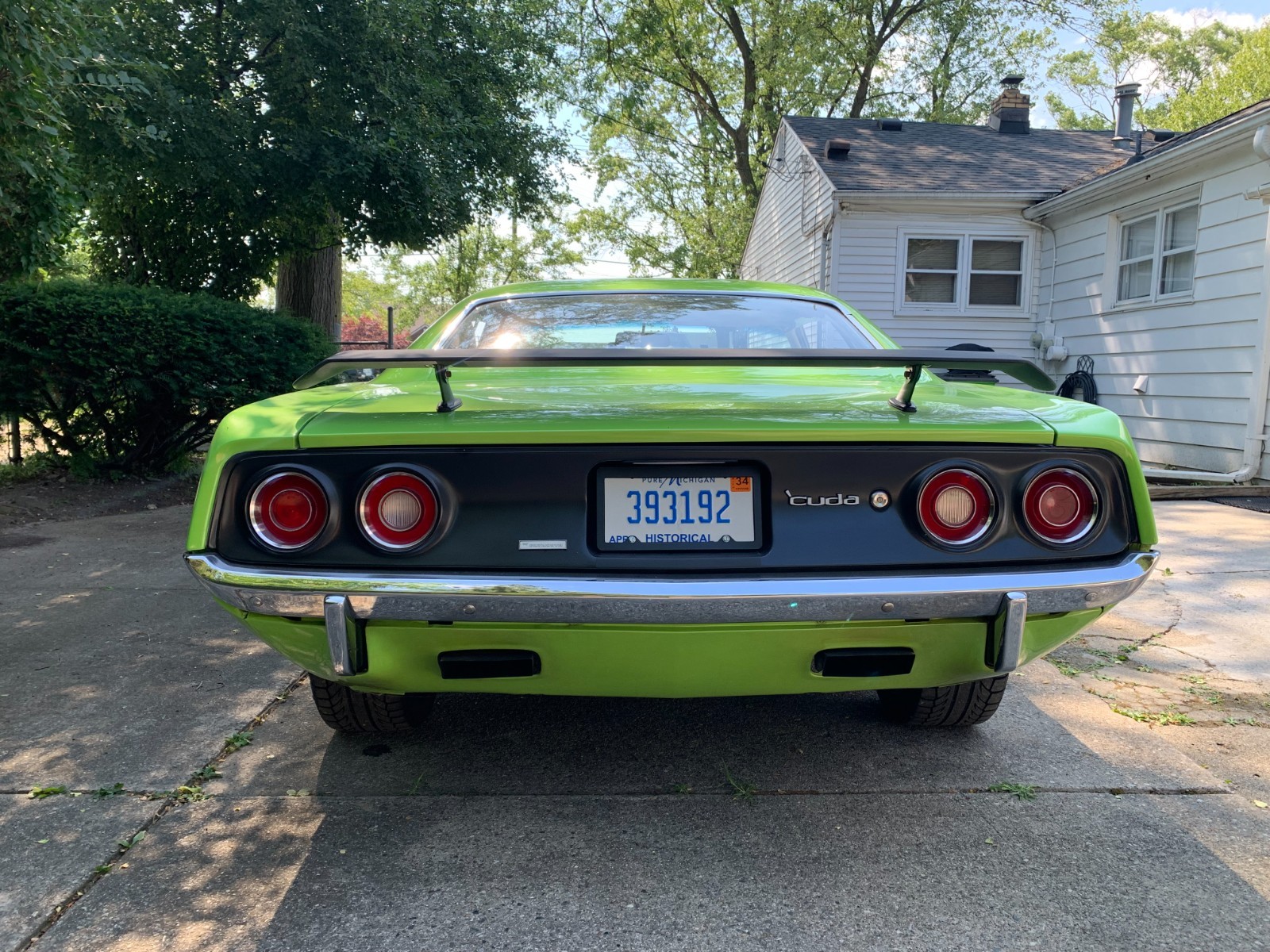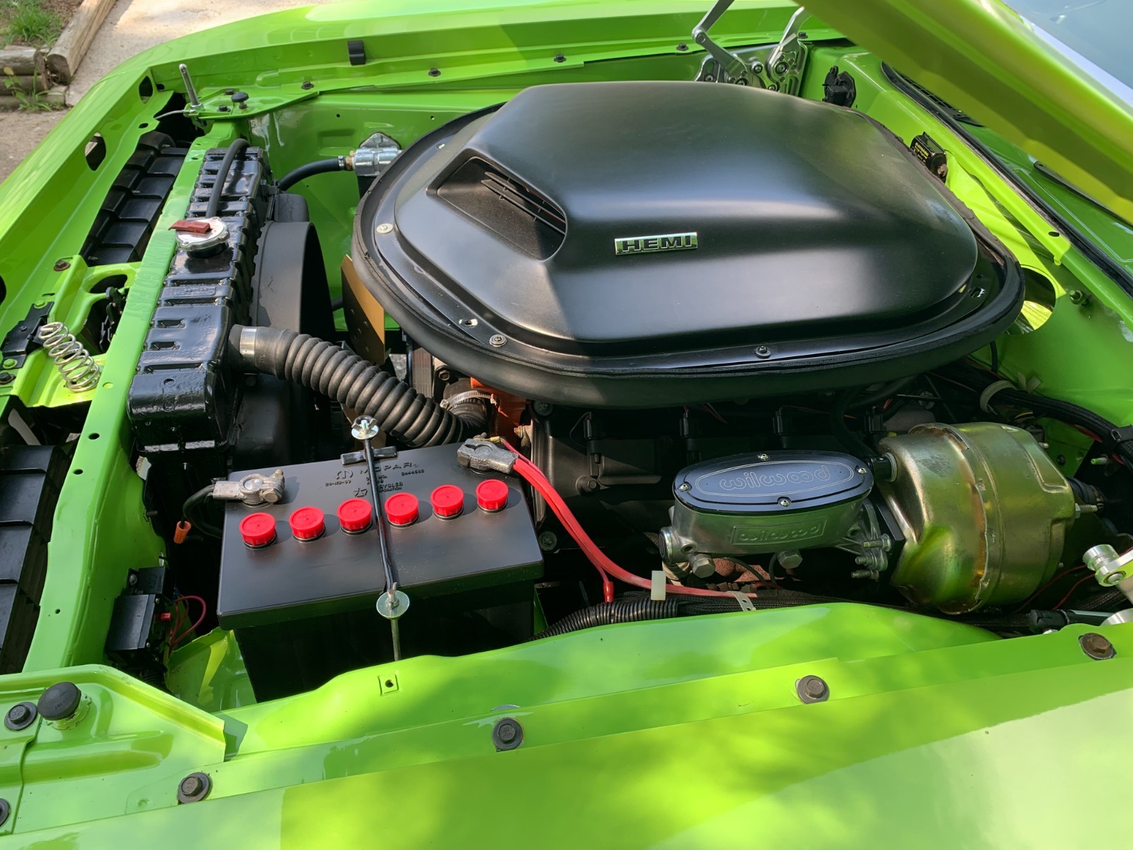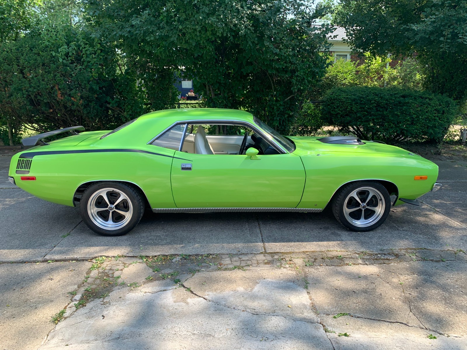 • Professional no expense spared Restoration.• Nice blend and balance of modern mechanical components and maintaining the original classic styling look.• Modern Hemi aluminum head crate engine with 2X4bbls dual quad carbs!• Great looking iconic “Shaker “ hood w/functional cold air induction system• Newer HD 3 Speed Torqueflite Automatic transmission with pistol grip shifter in console.• Upgraded "fast ratio" Power Steering System• Upgraded Wilwood power disc braking system w/ cross drilled + slotted rotors• Beautiful Mirror finish Limelight Pearl Green paint with black callouts show waxed and detailed to a mirror finish• Great looking Front & Rear Spoilers with Lower Rocker "Gill" Mouldings• Beautiful Chrome Bumpers, Sill Mouldings, and Stainless Mouldings throughout• Chrome factory style Hood Pins and Billet Hood Hinges• Great looking factory white bucket Seat interior with factory console• Custom white face gauge dash with Gauges for all the engine vitals• Newer interior including Seats, Door Panels, Carpet and Headliner• Period correct 2 spoke “Tuff”-spoke steering wheel• Pioneer digital sound system with hi fi speaker system• Show ready detailed engine compartment and undercarriage throughout• American racing Magnum 500 replica 17" alloys w/ BFG G force T/A's and Posi Rear End.• Great sounding Polished dual exhaust system w/ correct 'Cuda tips.• Quality fabrication and installation of all custom parts - nice build.- This is how to buy a great looking and great running and driving muscle car with a nice stance.- I'm a private seller not a dealer and own the car so feel free to come see the car in person if your local and just call me to setup a time to view. Mileage listed is what is displayed on the odometer and I do not know the actual mileage._Car is Sold in "As is Where is" Condition. Buyer is responsible for shipping or pickup of vehicle and I can assist with loading if needed.- Please Note: I do have a small bank loan out on the car through my bank and the Title has my name and bank as secured party on it. I will need to pay this loan off with partial funds from the sale of the car to get the release of Lien for the title from the bank once loan is paid off. I can work with you through this process on how best to securely handle the sale, loan payoff, and release of lien on title to complete sale to you.- Any inquires or additional information please email me or Contact me Chris at 586-596-0346. Thanks for looking.