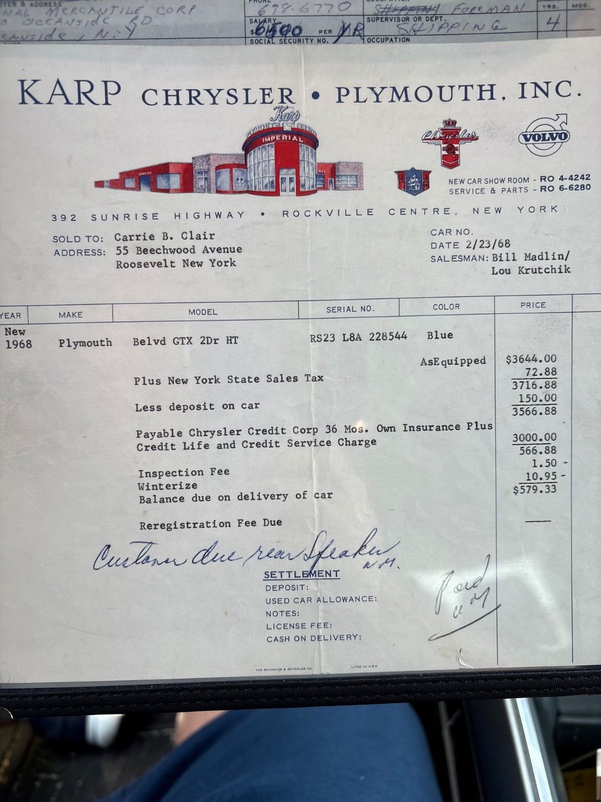real 1968 GTX !!!!!! just picked a untouched barn find original owner 47,000 miles was taken off the road as registration sticker says in 1974 put away never to come out until now . runs drives amazing no rot floors body perfect every peace of paperwork when purchased new even factory tire jack car runs and drives great new brake lines new gastank and sender gasline carb rebuilt all lights wipers just painted new stripe kit and new emblems car is real nice new carpet seat covers please feel free to contact me if your serious buyer 516-448-3214 |