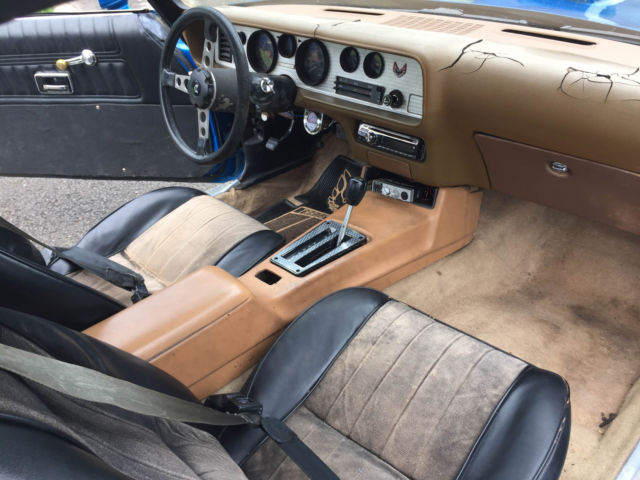 I have my 1977 Trans Am for sale. We have the PHS on the car and it rolled out of the factory in 1977 in Starlight Black, lack vinyl Interior, he performance cam (rated 220hp), ower steering, ower brakes, nd a 4 speed. It now has an interior that is both black and tan and is now painted Martinique Blue, hich is a 1978 only color. The transmission was swapped by the previous owner to a turbo 400 with a shift kit and new main seals. Non-numbers matching motor is a rebuilt Pontiac 400 that came out of another 1977 Pontiac. Has a brand new Holley 650 double pumper with an electric choke and a brand new HEI distributor sitting on top of an Edelbrock air gap intake. The drivetrain is very solid, o leaks or issues and pulls great. I changed the oil with full synthetic right after I bought the car, hich was around 500 miles after both drivetrain rebuilds. I've redone the entire exhaust with ceramic coated long tube headers, .5 inch pipe and 12 inch glasspacks done at the local exhaust shop in downtown Franklin. It has a normal amount of rust for the year, he trunk and front floorpans are good but the rear passenger floorpans need replaced. Also some rust under doors. Brand new brake job, ut one of the front rotors is slightly warped but only noticeable when stopping from 40+ mph. It still stops very well at all speeds regardless. The dash could use re-wiring, ecause the backlight illumination and some of the gauges aren't working. Recently the speedometer cable melted to the header, o a brand new one is in and tied away from the header but still needs to be connected. Vintage CB radio from 1980 which works but needs a mic. 3:31 open gears in a 10 bolt rear end. It is a great driver quality car, ut could still use some interior work (see photos). Solid car for a restoration, ro touring project, r just a driver like I used it for. Remember this was an all black 4 speed car. Thanks and feel free to ask any questions.