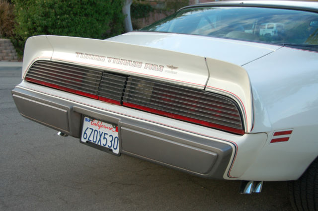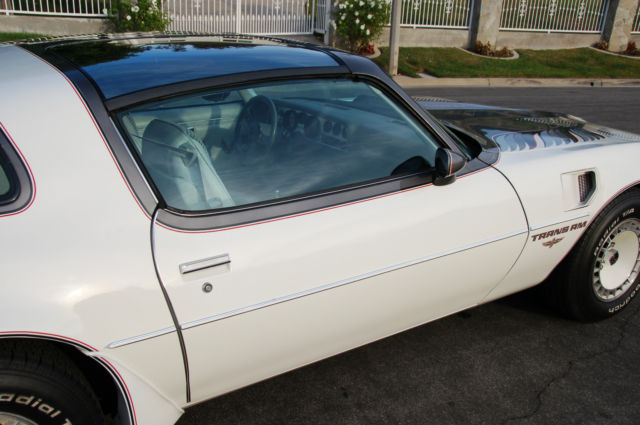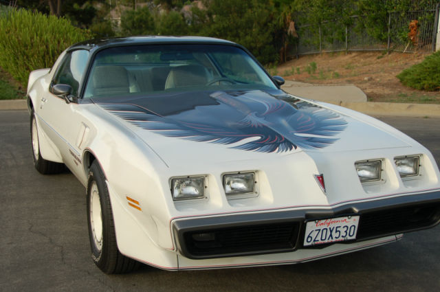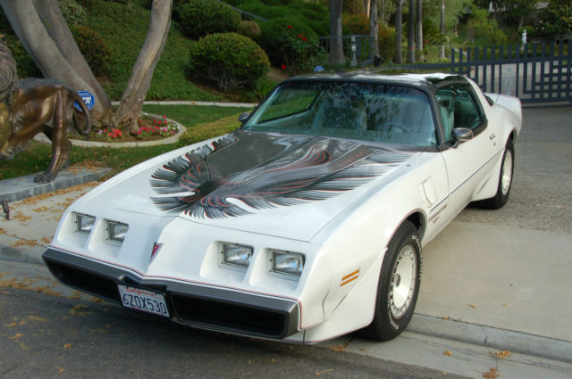 Please allow time for all 95 photos to load and inspect as exceptional automobiles such as this rarely come along. For a slideshow of all the photos on this listing plus 100 Extra Super Detailed, lose-Up Photos, lick this link: http://s746.photobucket.com/user/cars2k/slideshow/1980%20Pontiac%20Trans%20Am%20Turbo%20Pace%20Car?sort=9 The ultimate Trans Am Turbo was the 1980 Indianapolis 500 Pace Car Replica, uilt to commemorate the first time a single car paced both the Indy 500 and the Daytona 500 in the same year. It is essentially a Trans Am with the 301 turbo engine and every available Firebird option, ncluding a T-top roof, ir conditioning, imited-slip differential, hite-painted alloy wheels, full load of convenience features and the WS6 Performance Handling Package which included four-wheel disc brakes and stiffer suspension components. Pace Car replicas were available only in Cameo White with gray accents — and a unique hood decal even more dramatic than the normal Firebird. Check out this Road & Track article on the collectability of these Pace Cars: http://www.roadandtrack.com/car-culture/a4673/boot-snap-this-up-65-1-roa0813/ A mere 5,700 Pace Cars were built 35 years ago; few of these ‘birds have survived; even fewer are in pristine condition. Here's one! Currently owned by a prominent O.C. businessman, he car is always garaged and covered; living a sheltered life among his private collection. Hence, unique opportunity arises to obtain a coveted Pace Car, ne that enjoyed a most beneficial climate, ampered beyond belief by a mature owner with big pockets and the willingness to pay up for the best service money can buy. The miles shown on the odometer—27,264--are of the original, ocumented kind! Let's check out this dream find now, nside and out!