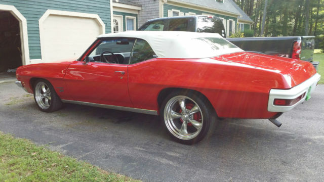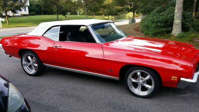 | 1972 lemans convertible body taken off frame frame beadblasted and painted all new body mounts fuel and gas lines new floors not a speck of rust underneathquarters were replaced as well .body painted red with black interior all work was done year and a half ago and three thousand miles were put on since.convertible top was replaced two years ago no rips minor cleaning needed to be perfect.pontiac 350 numbers matching engine and trans that runs beautifulcar just needs minor details to be finished . |