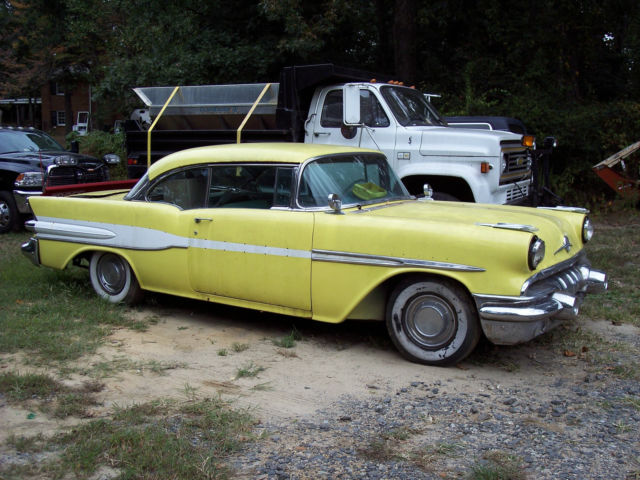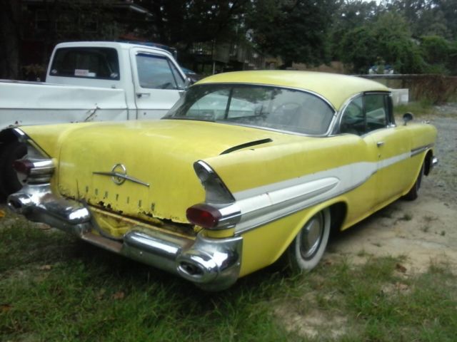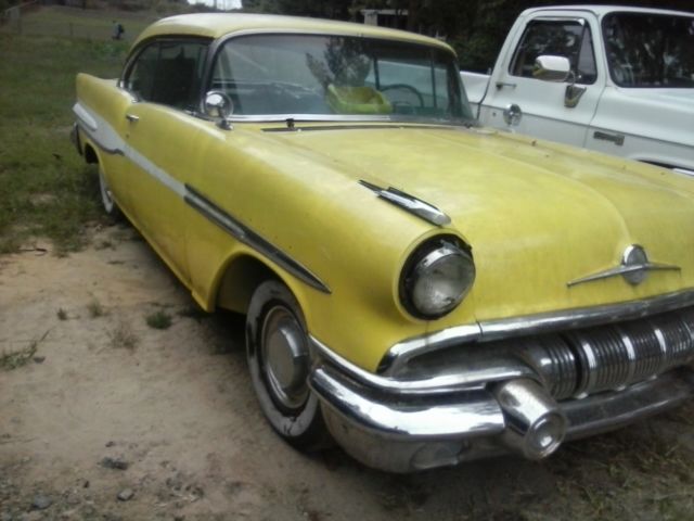 1957 Pontiac super chief two door hardtop with factory ac project. The good, ll glass is intact the doors shut well and it is 95% complete, he motor does run it moves and the body seems pretty solid the trunk floor and inner rocker panels look good . The bad, he drivers side front floor pan needs replaced it has heavy rust on the passengers side front floor with some rust through, he trunk lid needs replaced 1956 chevy trunk lids fit and are available new. What I found was missing, ir cleaner the stars for the passengers side the buckle for the rear center window trim and the emblem for the right front fender. I have the side body trim just needs one inch clips. if you have any questions please ask.