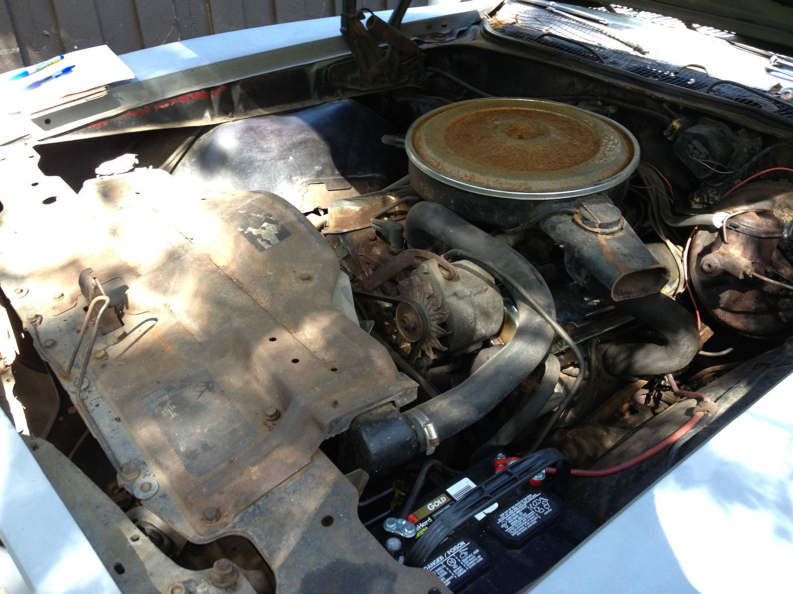 | Starts. runs. and drives. but wont stop! Needs brakes. Purchased vehicle to restore. but have 2 other restorations taking precedence. Car is solid. needs some body work. Some of the floor pans already completed as well as a newer white rag top. I consider the rust minimal! Interior seats (except for driver seat). body chrome. side mirror. badges. radio. antenna. front grill. seat belts. & console lid. are removed and in dry storage. Also included are a couple quarter patch panels. and RH rear quarter corner piece cut from another GTO- ready to replace quarter as pictured. Hideaway headlights are missing. standard grills have been replaced and are included. Otherwise the car is complete. Removed seats and previous noted pieces will be placed into the car and trunk before delivery. The car starts. runs & rolls. sorry but no test drives without brakes. I will test drive up and down a 100' driveway if necessary. See PHS Docs for all options and vehicle specs. 400 YS 9090071 correct code matching engine (engine serial# is non-matching). w/ Rochester Q-jet 4 bbl HO carb 7028268. Title & odometer reads 22. 62. which suspect/certain is incorrect. Expect all interested parties to ask any unanswered questions before making your bids. Be earnest and committed to purchase before placing your bid. Video taped the engine running and revving dated 12/12/14. If interested in viewing. please inquire. will forward the vid to you. Vehicle can be viewed and/or picked up after 12/25/14. I will assist any hired hauling services with the pick up. Wish I had the time to restore to its original turquoise interior and exterior color with a white rag top. a real beauty! Similar car pictured for reference. Also have a car trailer being sold "as is" for $700. lights. and winch work. tires have sidewall dry rot. but plenty of tread. Just in case the car becomes a trailer queen. contact if interested. Good luck! |